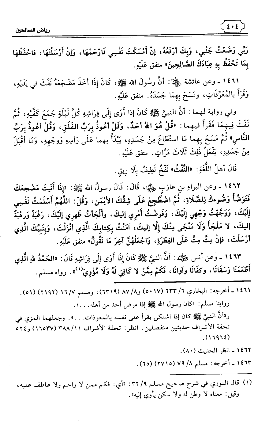 1462 - وعن البراءِ بنِ عازبٍ رضي الله عنهما، قَالَ: قَالَ رسولُ الله - صلى الله عليه وسلم: «إِذَا أَتَيتَ مَضْجعَكَ فَتَوَضَّأْ وَضُوءكَ لِلصَّلاَةِ، ثُمَّ اضْطَجِعْ عَلَى شِقِّكَ الأيْمَن، وَقُلْ: اللَّهُمَّ أَسْلَمْتُ نَفْسِي إِلَيْكَ، وَوَجَّهْتُ وَجْهِي إِلَيْكَ، وَفَوضْتُ أَمْرِي إليكَ، وأَلْجَأتُ ظَهرِي إلَيْكَ، رَغْبَةً وَرهْبَةً إليكَ، لا مَلْجَأَ وَلاَ مَنْجَا مِنْكَ إِلاَّ إليكَ، آمَنْتُ بِكِتابِكَ الَّذِي أنْزَلْتَ، وَبِنَبِيِّكَ الَّذِي أرْسَلْتَ، فإنْ مِتَّ مِتَّ عَلَى الفِطْرَةِ، وَاجْعَلْهُنَّ آخِرَ مَا تَقُولُ» متفق عَلَيْهِ. (¬1)