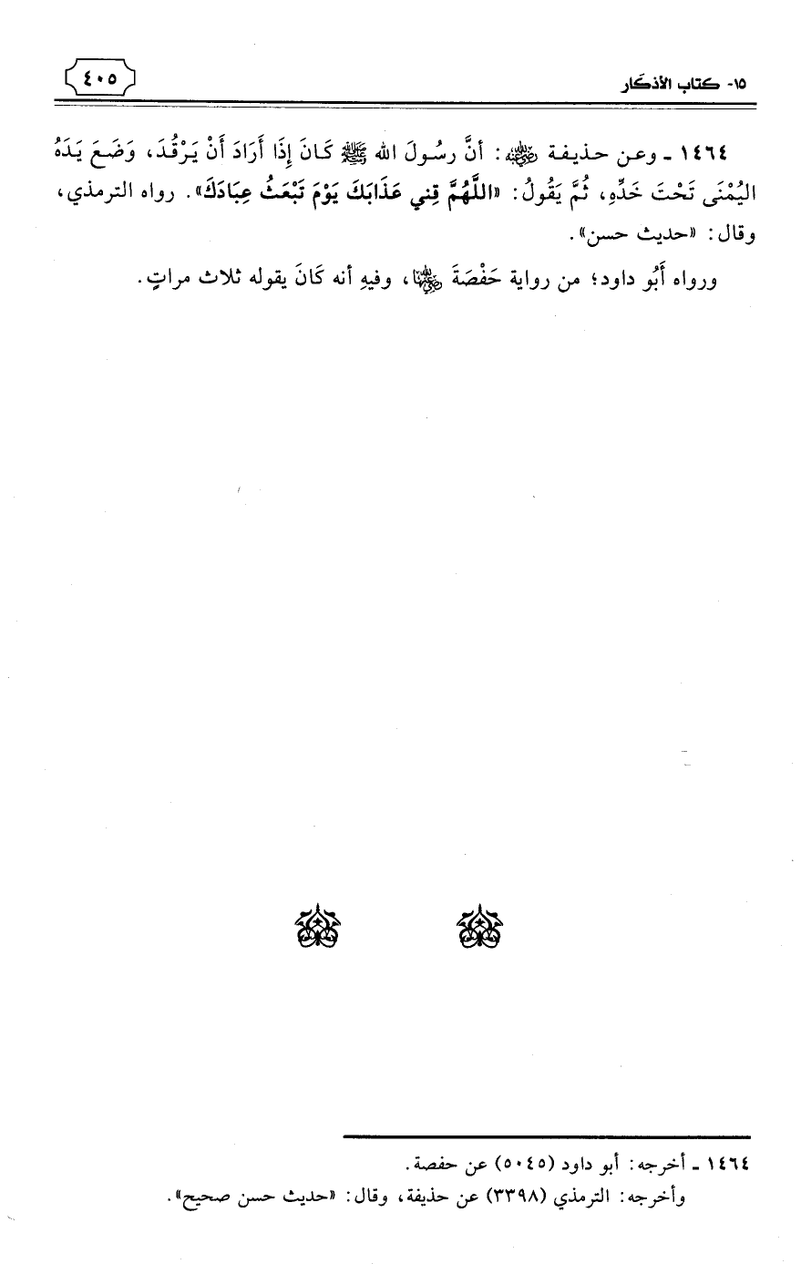 1464 - وعن حذيفة - رضي الله عنه: أنَّ رسُولَ الله - صلى الله عليه وسلم - كَانَ إِذَا أَرَادَ أَنْ يَرْقُدَ، وَضَعَ يَدَهُ اليُمْنَى تَحْتَ خَدِّهِ، ثُمَّ يَقُولُ: «اللَّهُمَّ قِني عَذَابَكَ يَوْمَ تَبْعَثُ عِبَادَكَ». رواه الترمذي، وقال: «حديث حسن».