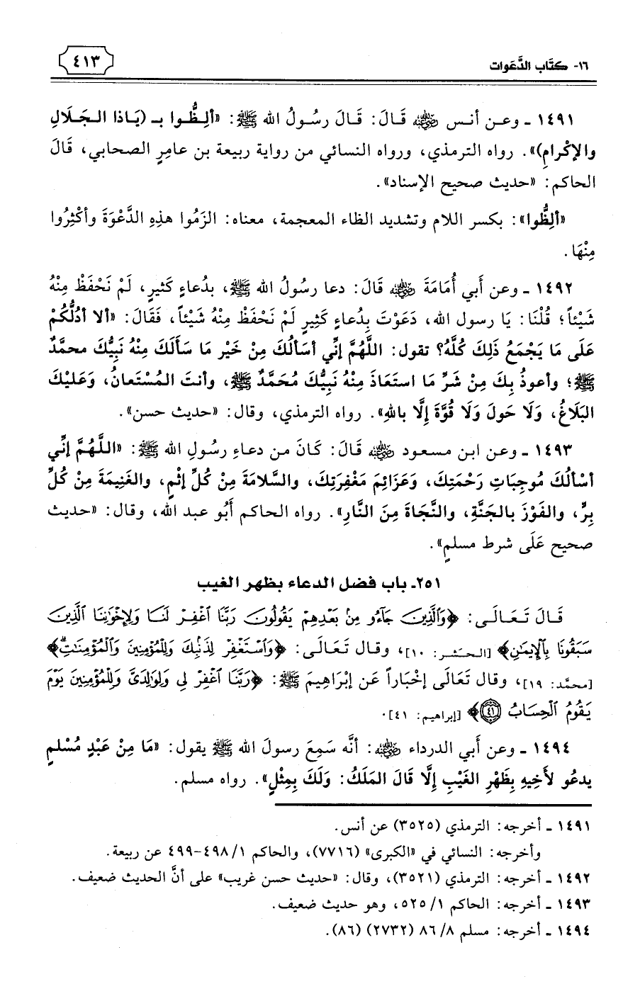 1491 - وعن أنس - رضي الله عنه - قَالَ: قَالَ رسُولُ الله - صلى الله عليه وسلم: «ألِظُّوا بـ (يَاذا الجَلاَلِ والإكْرامِ)». رواه الترمذي، (¬1) ورواه النسائي من رواية ربيعة بن عامِرٍ الصحابي، قَالَ الحاكم: «حديث صحيح الإسناد».