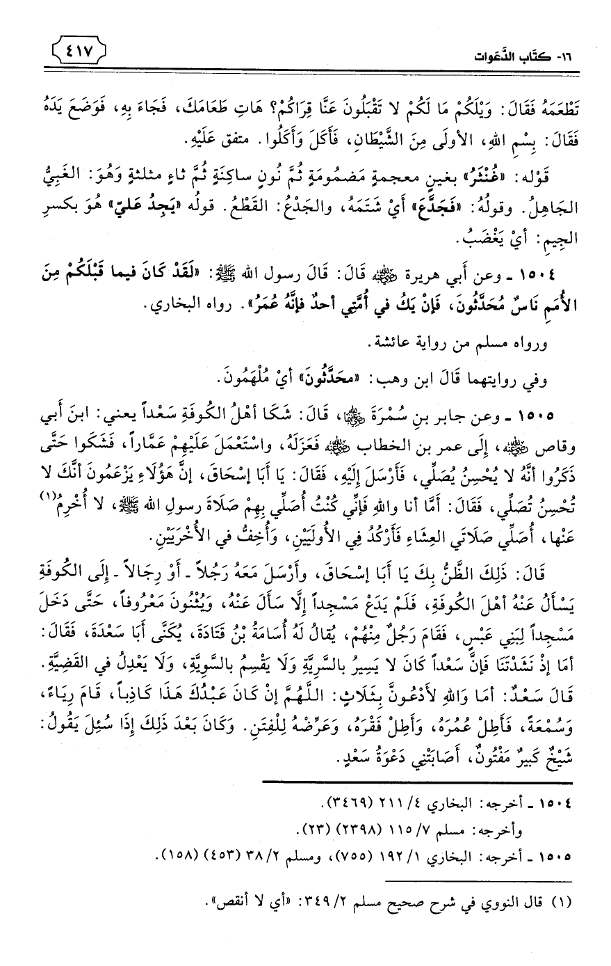 1505 - وعن جابر بنِ سُمْرَةَ رضي الله عنهما، قَالَ: شَكَا أهْلُ الكُوفَةِ سَعْدًا يعني: ابنَ أَبي وقاص - رضي الله عنه - إِلَى عمر بن الخطاب - رضي الله عنه - فَعَزَلَهُ، واسْتَعْمَلَ عَلَيْهِمْ عَمَّارًا، فَشَكَوا حَتَّى ذَكَرُوا أنَّهُ لا يُحْسِنُ يُصَلِّي، فَأَرْسَلَ إِلَيْهِ، فَقَالَ: يَا أَبَا إسْحَاقَ، إنَّ هَؤُلاَءِ يَزْعَمُونَ أنَّكَ لا تُحْسِنُ تُصَلِّي، فَقَالَ: أَمَّا أنا واللهِ فَإنِّي كُنْتُ أُصَلِّي بِهِمْ صَلاَةَ رسولِ الله - صلى الله عليه وسلم - لا أُخْرِمُ (¬1) عَنْها، أُصَلِّي صَلاَتَي العِشَاءِ فَأَرْكُدُ فِي الأُولَيَيْنِ، وَأُخِفُّ في الأُخْرَيَيْنِ. قَالَ: ذَلِكَ الظَّنُّ بِكَ يَا أَبَا إسْحَاقَ، وأَرْسَلَ مَعَهُ رَجُلًا - أَوْ رِجَالًا - إِلَى الكُوفَةِ يَسْأَلُ عَنْهُ أهْلَ الكُوفَةِ، فَلَمْ يَدَعْ مَسْجِدًا إِلاَّ سَأَلَ عَنْهُ، وَيُثْنُونَ مَعْرُوفًا، حَتَّى دَخَلَ مَسْجِدًا لِبَنِي عَبْسٍ، فَقَامَ رَجُلٌ مِنْهُمْ، يُقالُ لَهُ أُسَامَةُ بْنُ قَتَادَةَ، يُكَنَّى أَبَا سَعْدَةَ، فَقَالَ: أمَا إذْ نَشَدْتَنَا فَإنَّ سَعْدًا كَانَ لا يَسِيرُ بالسَّرِيَّةِ وَلاَ يَقْسِمُ بالسَّوِيَّةِ، وَلاَ يَعْدِلُ في القَضِيَّةِ. قَالَ سَعْدٌ: أمَا وَاللهِ لأَدْعُونَّ بِثَلاَثٍ: اللَّهُمَّ إنْ كَانَ عَبْدُكَ هَذَا كَاذِبًا، قَامَ رِيَاءً، وَسُمْعَةً، فَأَطِلْ عُمُرَهُ، وَأَطِلْ فَقْرَهُ، وَعَرِّضْهُ لِلْفِتَنِ. وَكَانَ بَعْدَ ذَلِكَ إِذَا سُئِلَ يَقُولُ: شَيْخٌ كَبيرٌ مَفْتُونٌ، أَصَابَتْنِي دَعْوَةُ سَعْدٍ. -[418]-