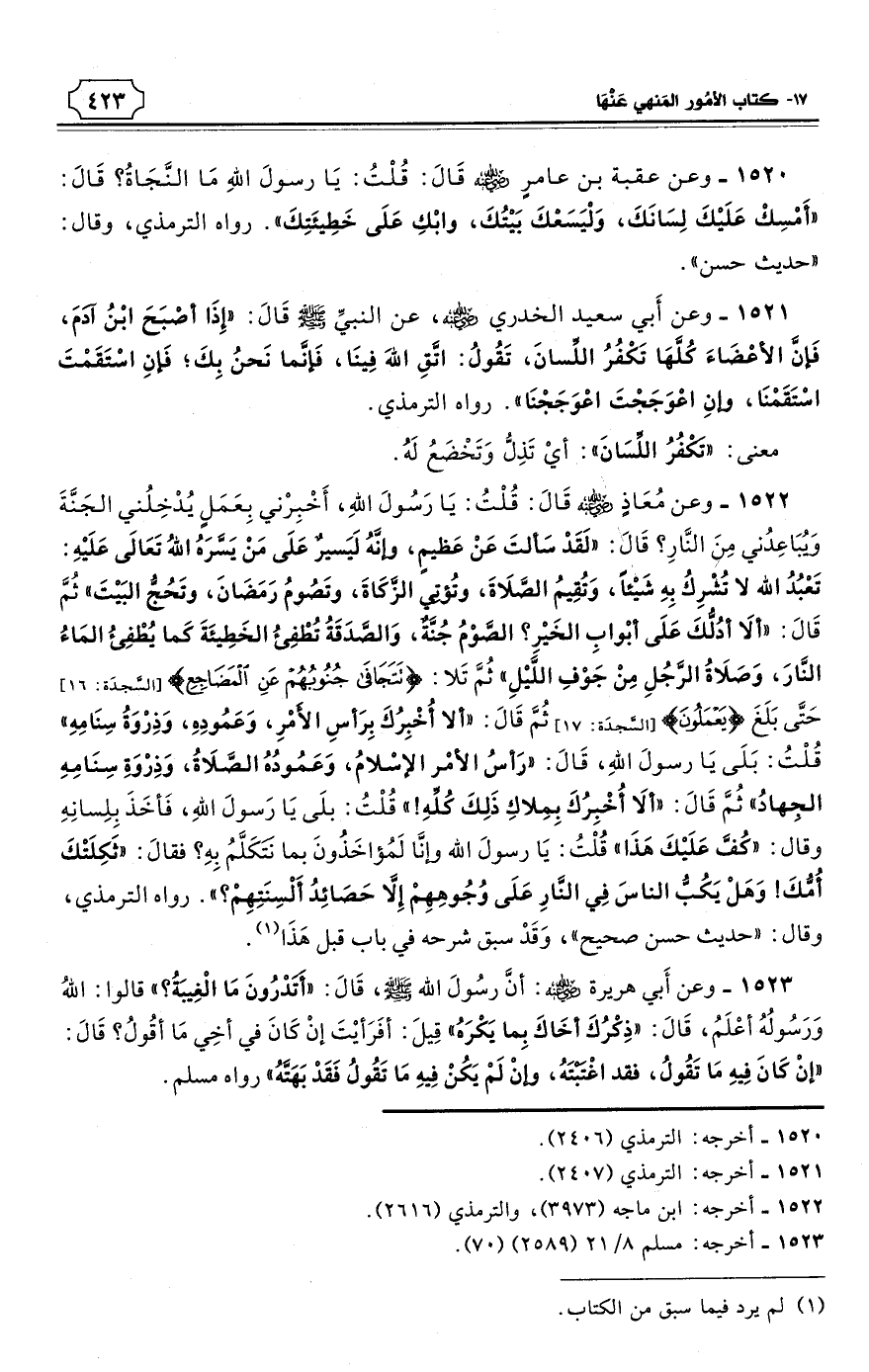 1522 - وعن مُعَاذٍ - رضي الله عنه - قَالَ: قُلْتُ: يَا رَسُولَ اللهِ، أَخْبِرْني بِعَمَلٍ يُدْخِلُني الجَنَّةَ وَيُبَاعِدُني مِنَ النَّارِ؟ قَالَ: «لَقَدْ سَألتَ عَنْ عَظيمٍ، وإنَّهُ لَيَسيرٌ عَلَى مَنْ يَسَّرَهُ اللهُ تَعَالَى عَلَيْهِ: تَعْبُدُ اللهَ لاَ تُشْرِكُ بِهِ شَيْئًا، وَتُقِيمُ الصَّلاَةَ، وتُؤتِي الزَّكَاةَ، وتَصُومُ رَمَضَانَ، وتَحُجُّ البَيْتَ» ثُمَّ قَالَ: «ألاَ أدُلُّكَ عَلَى أبْوابِ الخَيْرِ؟ الصَّوْمُ جُنَّةٌ، وَالصَّدَقَةُ تُطْفِئُ الخَطِيئَةَ كَما يُطْفِئُ المَاءُ النَّارَ، وَصَلاَةُ الرَّجُلِ مِنْ جَوْفِ اللَّيْلِ» ثُمَّ تَلا: {تَتَجَافَى جُنُوبُهُمْ عَنِ المَضَاجِعِ} حَتَّى بَلَغَ {يَعْمَلُونَ} [النور: 16] ثُمَّ قَالَ: «ألا أُخْبِرُكَ بِرَأسِ الأَمْرِ، وَعَمُودِهِ، وَذِرْوَةِ سِنَامِهِ» قُلْتُ: بَلَى يَا رسولَ اللهِ، قَالَ: «رَأسُ الأمْر الإسْلامُ، وَعَمُودُهُ الصَّلاَةُ، وَذِرْوَةِ سِنَامِهِ الجِهادُ» ثُمَّ قَالَ: «ألاَ أُخْبِرُكَ بِمِلاكِ ذَلِكَ كُلِّهِ!» قُلْتُ: بلَى يَا رَسولَ اللهِ، فَأخَذَ بِلِسانِهِ وقال: «كُفَّ عَلَيْكَ هَذَا» قُلْتُ: يَا رسولَ الله وإنَّا لَمُؤاخَذُونَ بما نَتَكَلَّمُ بِهِ؟ فقالَ: «ثَكِلَتْكَ أُمُّكَ! وَهَلْ يَكُبُّ الناسَ فِي النَّارِ عَلَى وُجُوهِهِمْ إِلاَّ حَصَائِدُ أَلْسِنَتِهِمْ؟». رواه الترمذي، (¬1) وقال: «حديث حسن صحيح»، وَقَدْ سبق شرحه في باب قبل هَذَا (¬2).