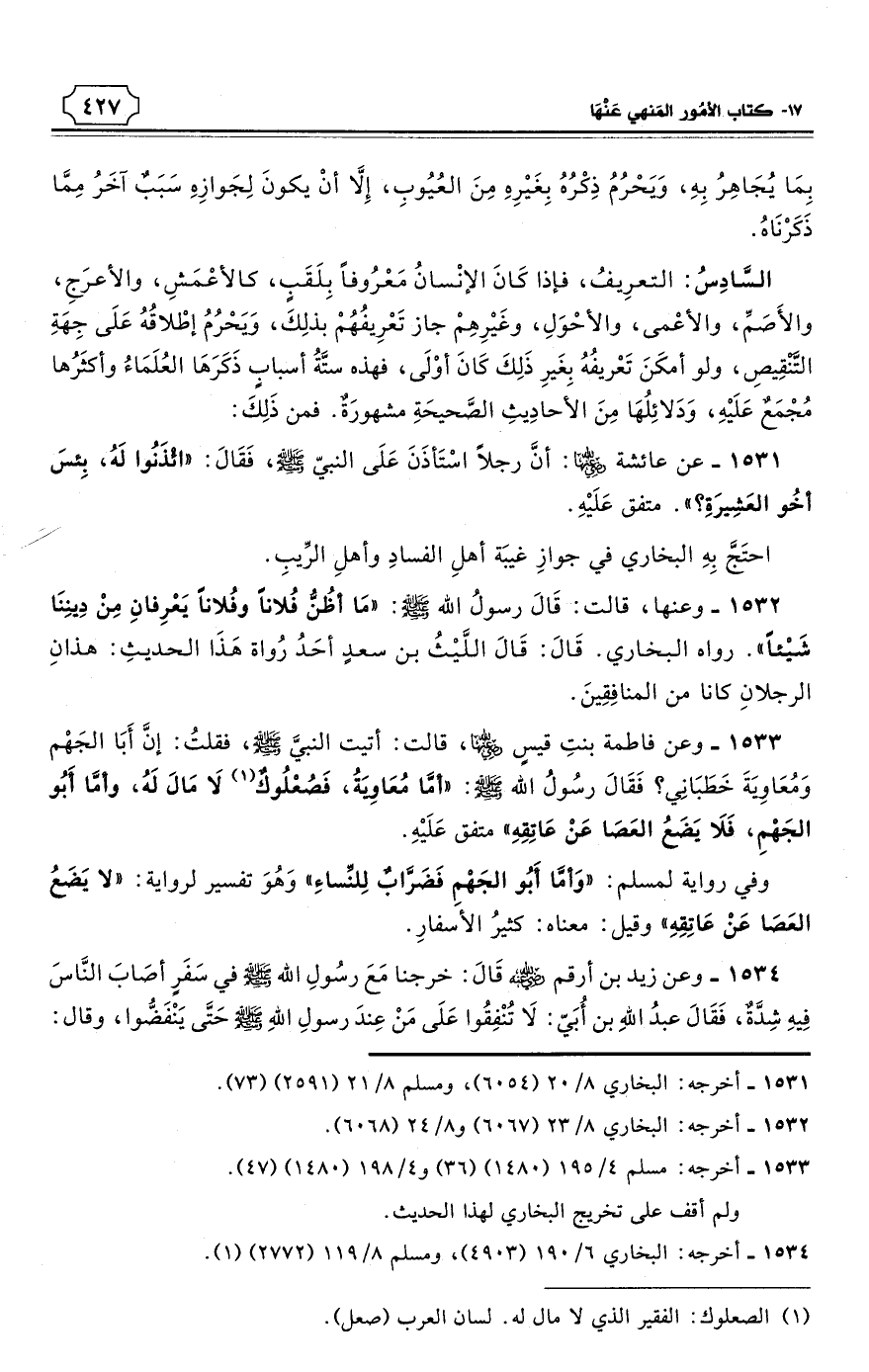 1531 - عن عائشة رَضِيَ اللهُ عنها: أنَّ رجلًا اسْتَأذَنَ عَلَى النبيّ - صلى الله عليه وسلم - فَقَالَ: «ائْذَنُوا لَهُ، بِئسَ أخُو العَشِيرَةِ؟». متفق عَلَيْهِ. (¬1)