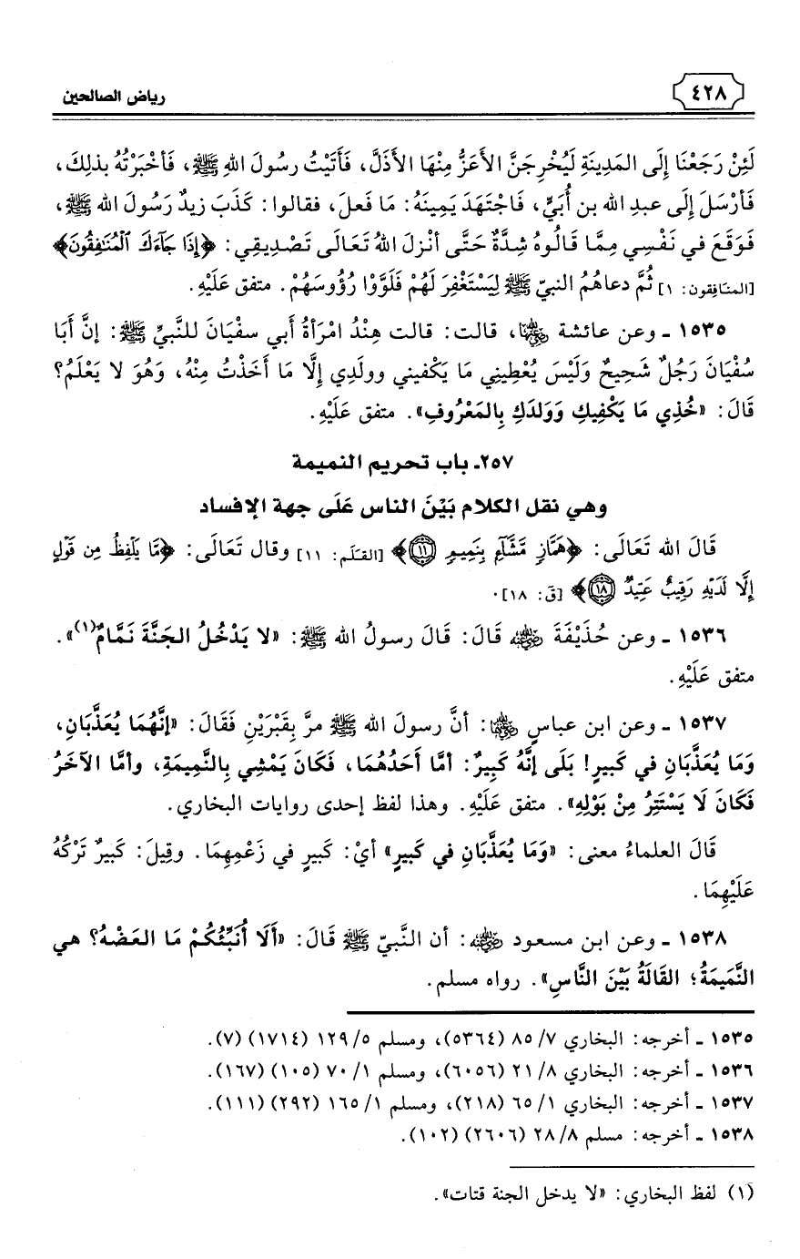 257 - باب تحريم النميمة وهي نقل الكلام بَيْنَ الناس عَلَى جهة الإفساد