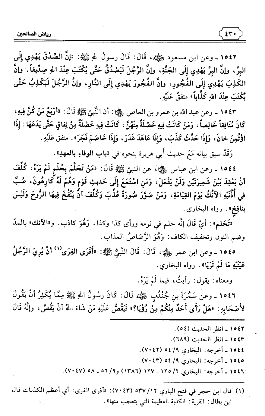 1545 - وعن ابن عمر رضي الله عنهما، قَالَ: قَالَ النَّبيُّ - صلى الله عليه وسلم: «أَفْرَى الفِرَى (¬1) أَنْ يُرِيَ الرَّجُلُ عَيْنَيْهِ مَا لَمْ تَرَيَا». رواه البخاري. (¬2)