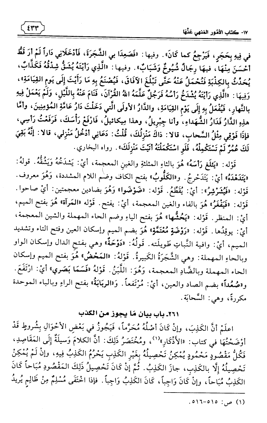 قَوْله: «يَثلَغ رَأسَهُ» هُوَ بالثاءِ المثلثةِ والغينِ المعجمة، أيْ: يَشدَخُهُ وَيَشُقُّهُ. قولهُ: «يَتَدَهْدَهُ» أيْ: يَتَدَحْرجُ. و «الكَلُّوبُ» بفتح الكاف وضم اللام المشددة، وَهُوَ معروف. قَوْله: «فَيُشَرْشِرُ»: أيْ: يُقَطِّعُ. قَوْله: «ضَوْضَوا» وَهُوَ بضادين معجمتين: أيْ صاحوا. قَوْله: «فَيَفْغَرُ» هُوَ بالفاء والغين المعجمة، أيْ: يفتح. قَوْله «المَرآة» هُوَ بفتح الميم، أيْ: المنظر. قَوْله: «يَحُشُّها» هُوَ بفتح الياءِ وضم الحاء المهملة والشين المعجمة، أيْ: يوقِدُها. قَوْله: «رَوْضَةٍ مُعْتَمَّةٍ» هُوَ بضم الميم وإسكان العين وفتح التاء وتشديد الميم، أيْ: وافية النَّباتِ طَويلَته. قَولُهُ: «دَوْحَةٌ» وهي بفتحِ الدال وإسكان الواو وبالحاءِ المهملة: وهي الشَّجَرَةُ الكَبيرةُ. قَوْلهُ: «المَحْضُ» هُوَ بفتح الميم وإسكان الحاء المهملة وبالضَّادِ المعجمة، وَهُوَ: اللَّبَنُ. قَوْلهُ «فَسَمَا بَصَري» أيْ: ارْتَفَعَ. و «صُعُدًا» بضم الصاد والعين، أيْ: مُرْتَفعًا. وَ «الربَابَةُ» بفتح الراءِ وبالباء الموحدة مكررةً، وهي: السَّحابَة.