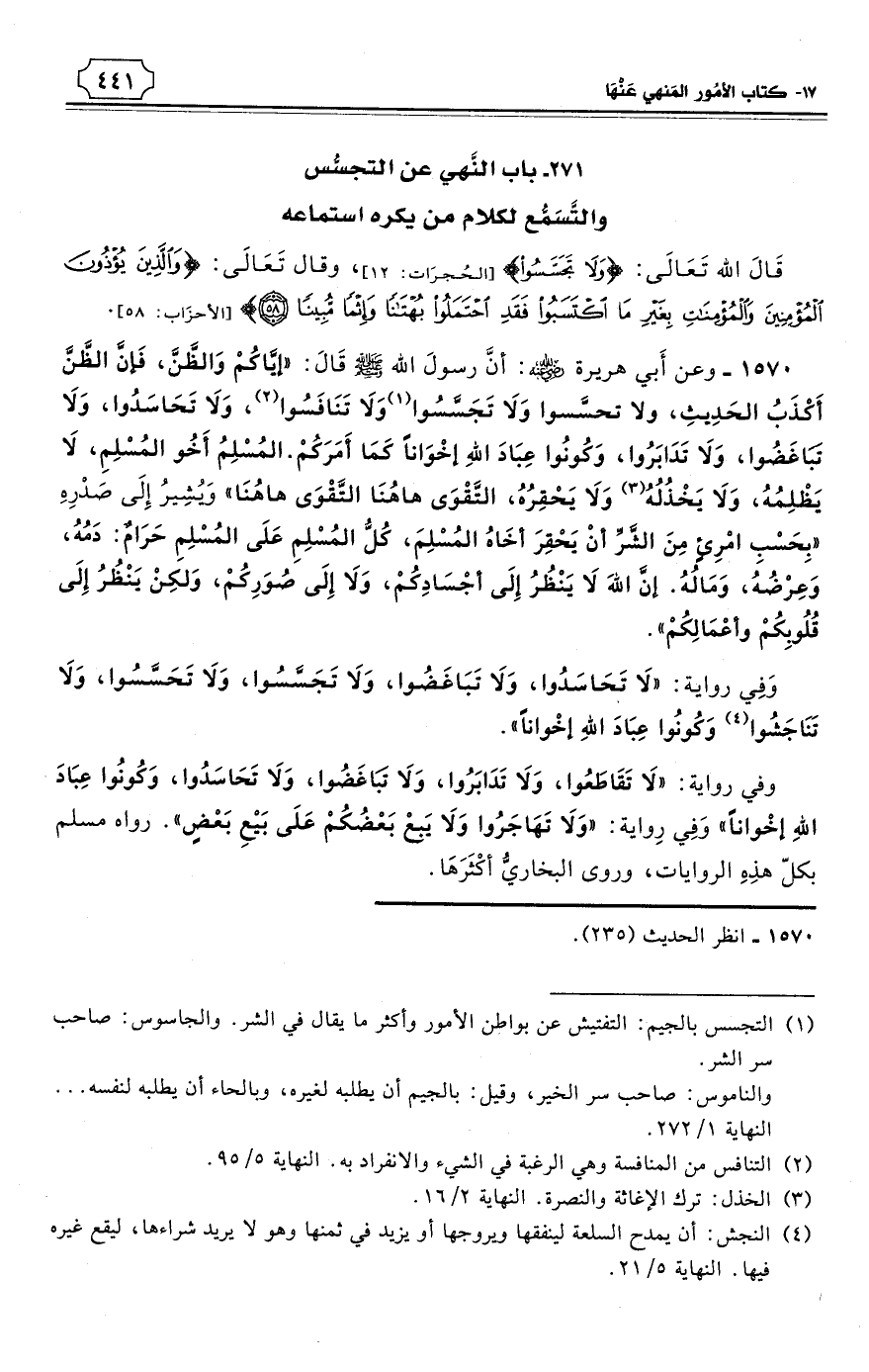 وَفِي رواية: «لاَ تَحَاسَدُوا، وَلاَ تَبَاغَضُوا، وَلاَ تَجَسَّسُوا، وَلاَ تَحَسَّسُوا، وَلاَ تَنَاجَشُوا (¬4) وَكُونُوا عِبَادَ اللهِ إخْوانًا».