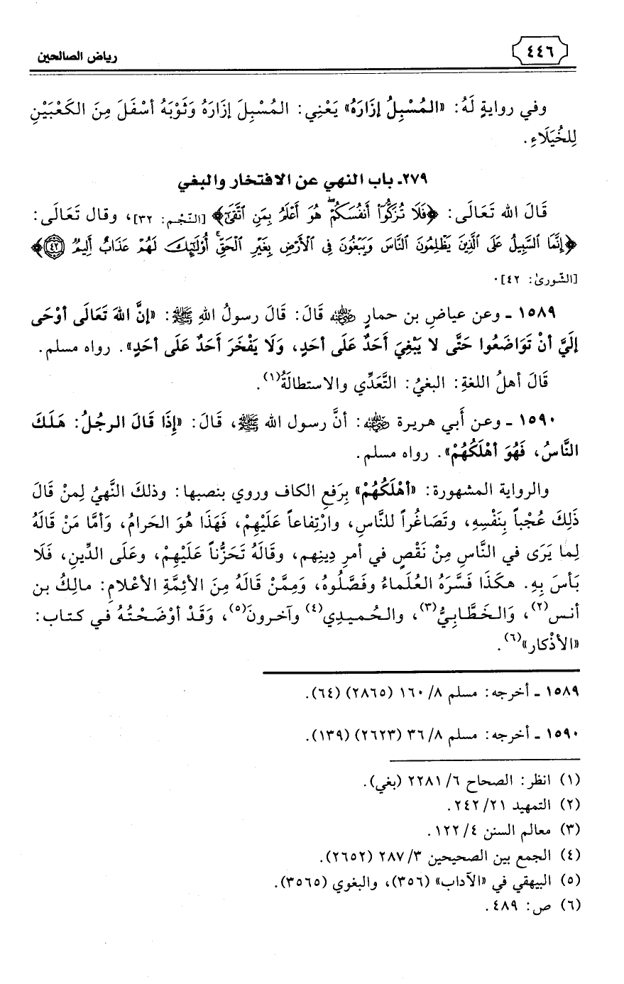 قَالَ الله تَعَالَى: {فَلاَ تُزَكُّوا أنْفُسَكُمْ هُوَ أعْلَمُ بِمَنِ اتَّقَى} [النجم: 32]، وقال تَعَالَى: {إنَّمَا السَّبِيلُ عَلَى الَّذِينَ يَظْلِمُونَ النَّاسَ وَيَبْغُونَ في الأَرْضِ بِغَيْرِ الحَقِّ أُوْلَئِكَ لَهُمْ عَذَابٌ أَليمٌ} [الشورى: 42]