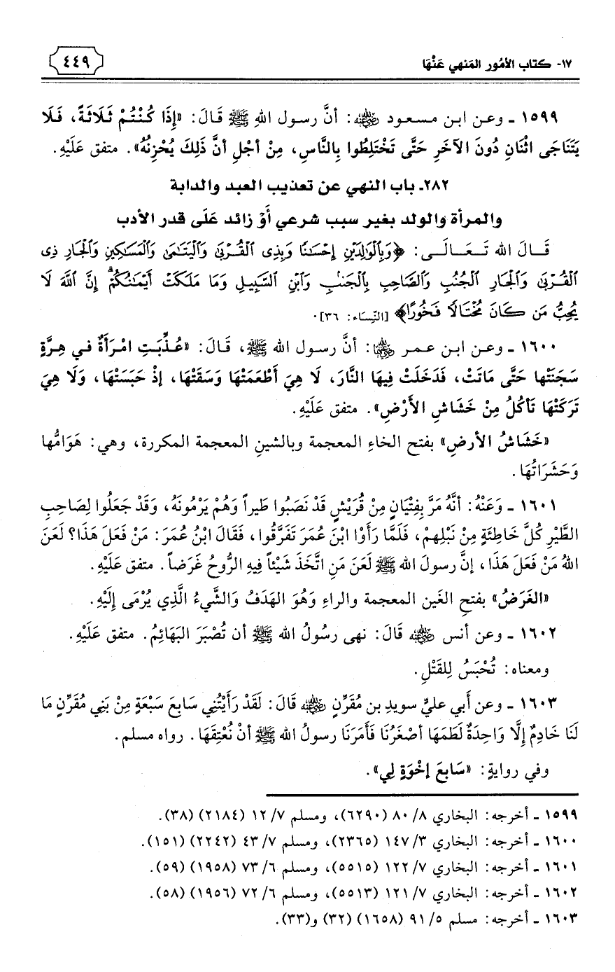 282 - باب النهي عن تعذيب العبد والدابة والمرأة والولد بغير سبب شرعي أَوْ زائد عَلَى قدر الأدب