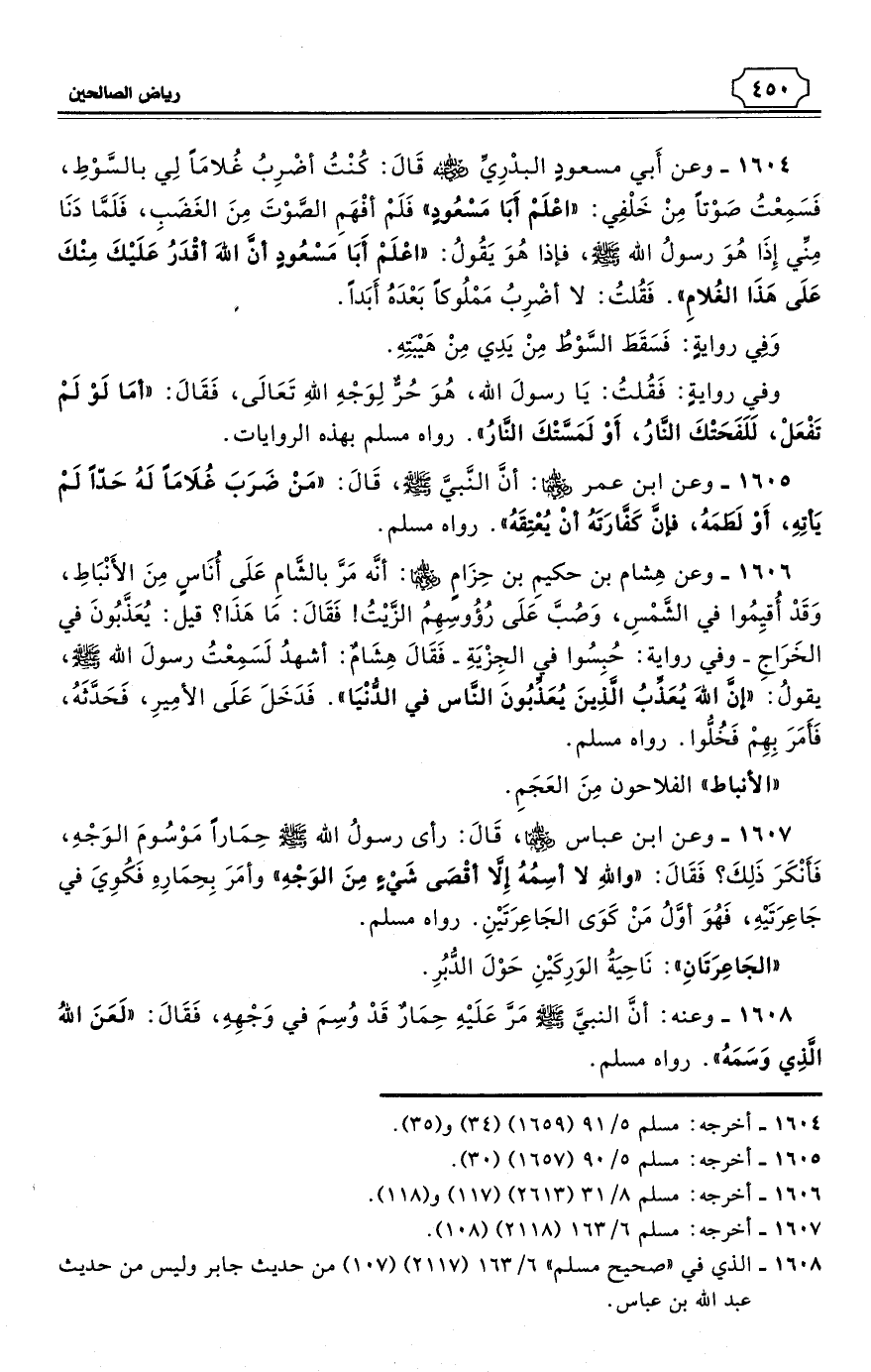 1604 - وعن أَبي مسعودٍ البدْرِيِّ - رضي الله عنه - قَالَ: كُنْتُ أضْرِبُ غُلامًا لِي بالسَّوْطِ، فَسَمِعْتُ صَوْتًا مِنْ خَلْفِي: «اعْلَمْ أَبَا مَسْعُودٍ» فَلَمْ أفْهَمِ الصَّوْتِ مِنَ الغَضَبِ، فَلَمَّا دَنَا مِنِّي إِذَا هُوَ رسولُ الله - صلى الله عليه وسلم - فإذا هُوَ يَقُولُ: «اعْلَمْ أَبَا مَسْعُودٍ أنَّ اللهَ أقْدَرُ عَلَيْكَ مِنْكَ عَلَى هَذَا الغُلامِ». فَقُلتُ: لا أضْرِبُ مَمْلُوكًا بَعْدَهُ أَبَدًا.