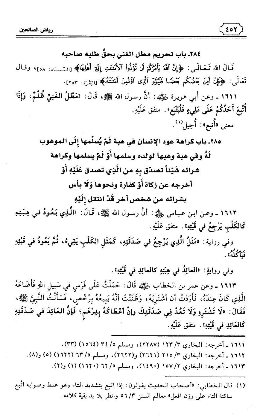285 - باب كراهة عود الإنسان في هبة لَمْ يُسلِّمها إِلَى الموهوب لَهُ وفي هبة وهبها لولده وسلمها أَوْ لَمْ يسلمها وكراهة شرائه شَيْئًا تصدّق بِهِ من الَّذِي تصدق عَلَيْهِ أَوْ أخرجه عن زكاة أَوْ كفارة ونحوها وَلاَ بأس بشرائه من شخص آخر قَدْ انتقل إِلَيْهِ