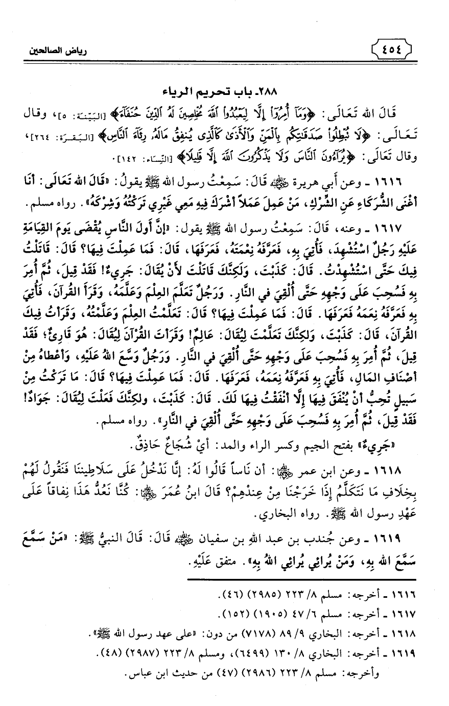 قَالَ الله تَعَالَى: {وَمَا أُمِرُوا إِلاَّ لِيَعْبُدُوا اللهَ مُخْلِصِينَ لَهُ الدِّينَ حُنَفَاءَ} [البينة: 5]، وقال تَعَالَى: {لا تُبْطِلُوا صَدَقَاتِكُمْ بِالمَنِّ وَالأَذَى كالَّذِي يُنْفِقُ مَالَهُ رِئَاءَ النَّاسِ} [البقرة: 264]، وقال تَعَالَى: {يُرَاءونَ النَّاسَ وَلاَ يَذْكُرُونَ اللهَ إِلاَّ قَلِيلًا} [النساء: 142].