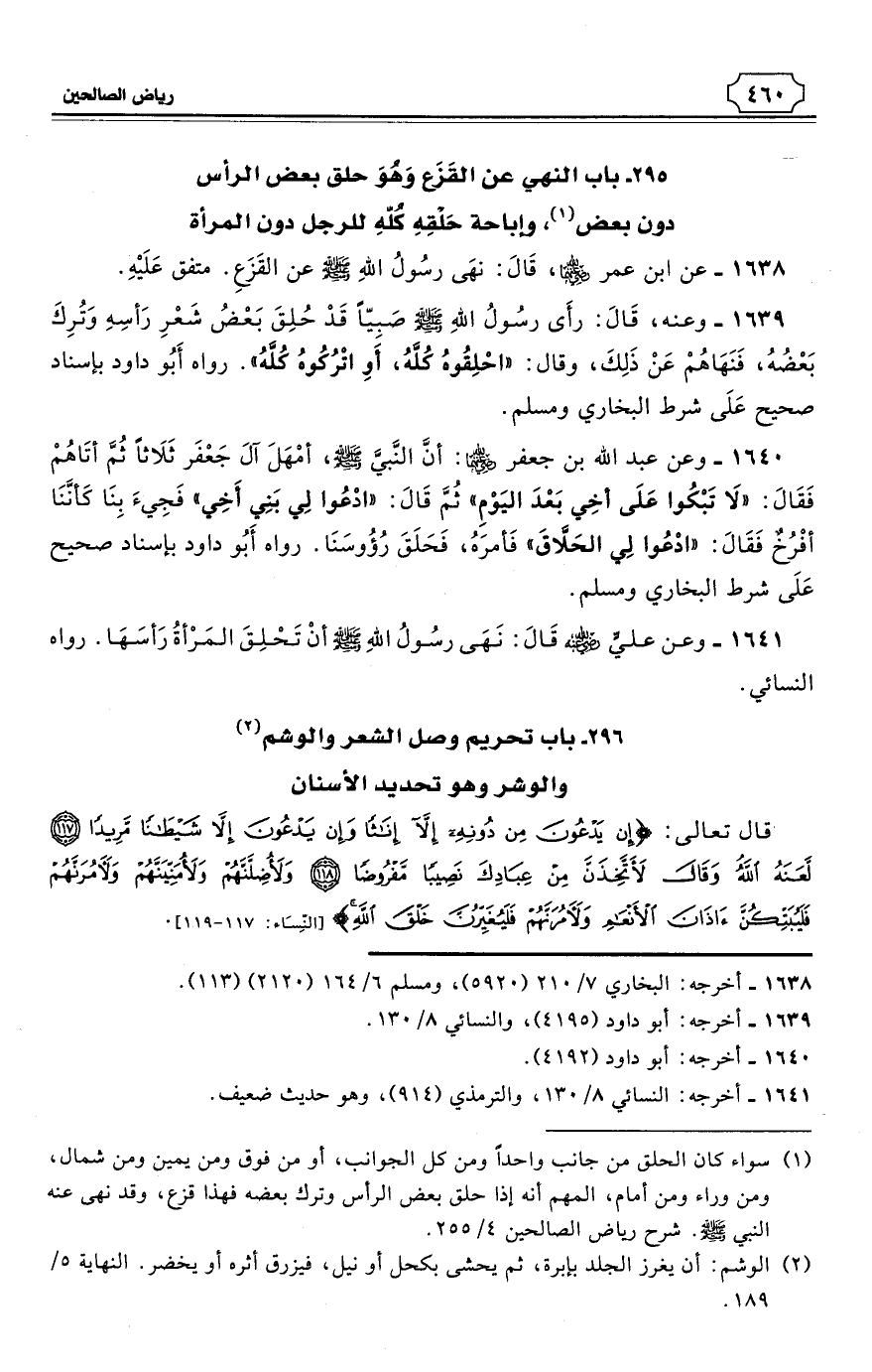 1639 - وعنه، قَالَ: رأَى رسُولُ اللهِ - صلى الله عليه وسلم - صَبِيًّا قَدْ حُلِقَ بَعْضُ شَعْرِ رَأسِهِ وَتُرِكَ بَعْضُهُ، فَنَهَاهُمْ عَنْ ذَلِكَ، وقال: «احْلِقُوهُ كُلَّهُ، أَوِ اتْرُكُوهُ كُلَّهُ». رواه أَبُو داود بإسناد صحيح عَلَى شرط البخاري ومسلم. (¬1)