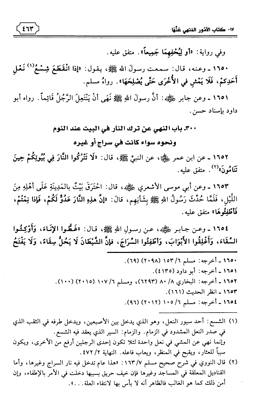 (¬1) قال النووي في شرح صحيح مسلم 7/ 163: «هذا عام تدخل فيه نار السراج وغيرها، وأما القناديل المعلقة في المساجد وغيرها فإن خيف حريق بسببها دخلت في الأمر بالإطفاء، وإن أمن ذلك كما هو الغالب فالظاهر أنه لا بأس بها لانتفاء العلة ... ».