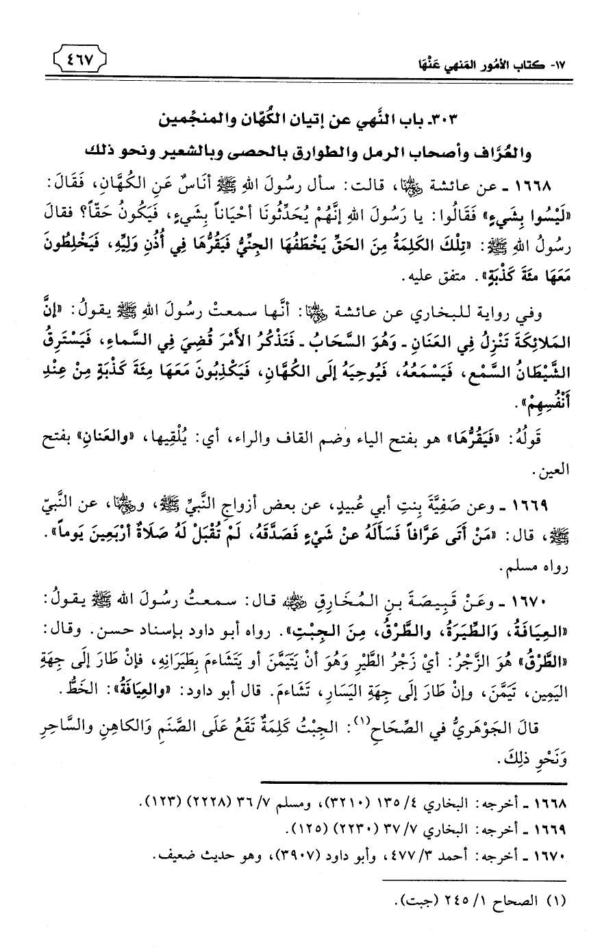 303 - باب النَّهي عن إتيان الكُهّان والمنجِّمين والعُرَّاف وأصحاب الرمل والطوارق بالحصى وبالشعير ونحو ذلك