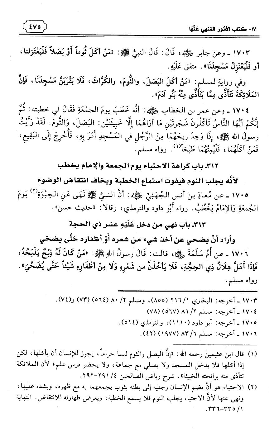 (¬1) قال ابن عثيمين رحمه الله: «إنَّ البصل والثوم ليسا حرامًا، يجوز للإنسان أن يأكلها، لكن إذا أكلها فلا يدخل المسجد ولا يصلي مع جماعة، ولا يحضر درس علم؛ لأن الملائكة تتأذى منه برائحته الخبيثة». شرح رياض الصالحين 4/ 291 - 292.