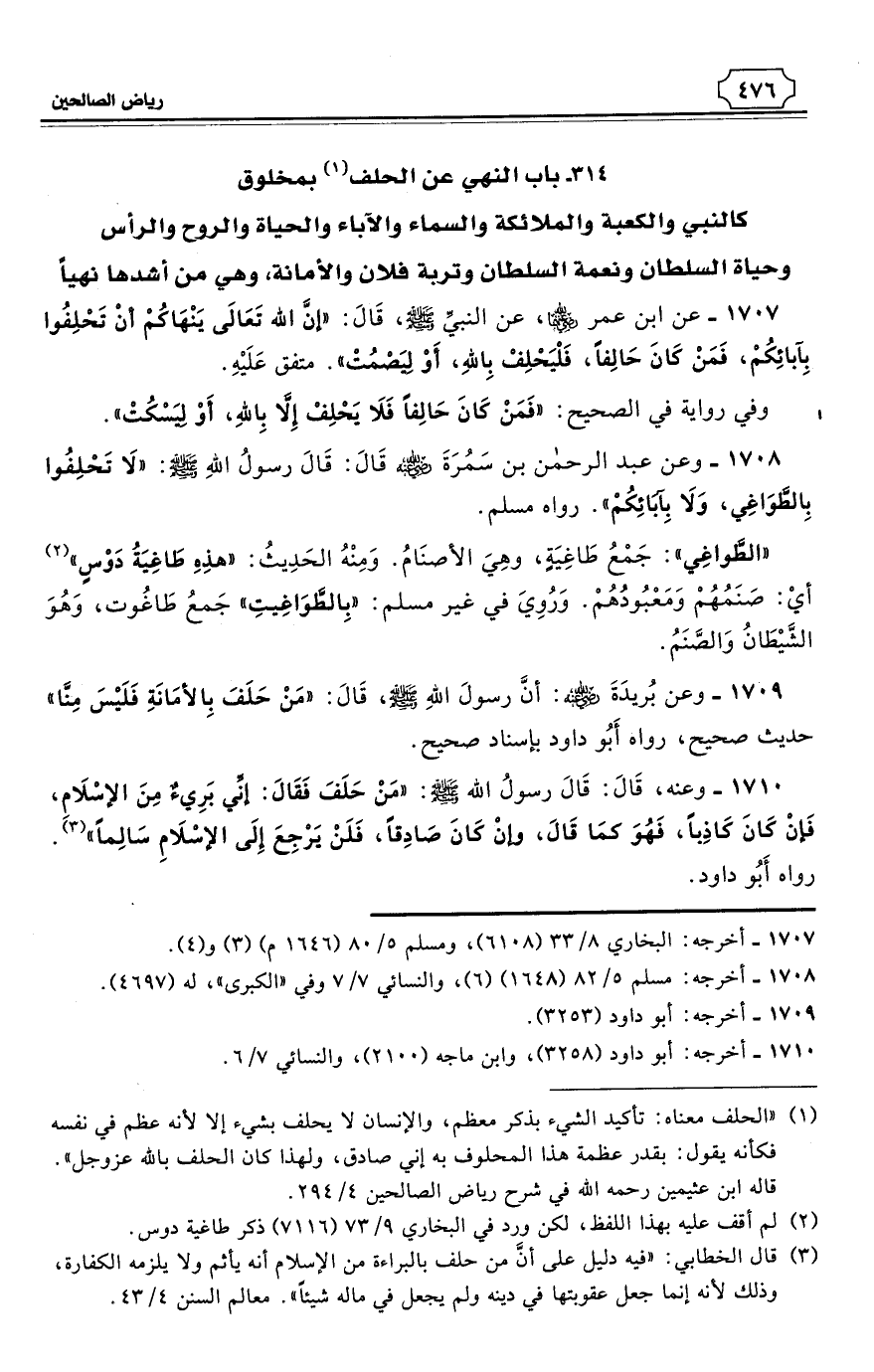 1708 - وعن عبد الرحمن بن سَمُرَةَ - رضي الله عنه - قَالَ: قَالَ رسولُ اللهِ - صلى الله عليه وسلم: «لاَ تَحْلِفُوا بِالطَّوَاغِي، وَلاَ بِآبَائِكُمْ». رواه مسلم. (¬1)