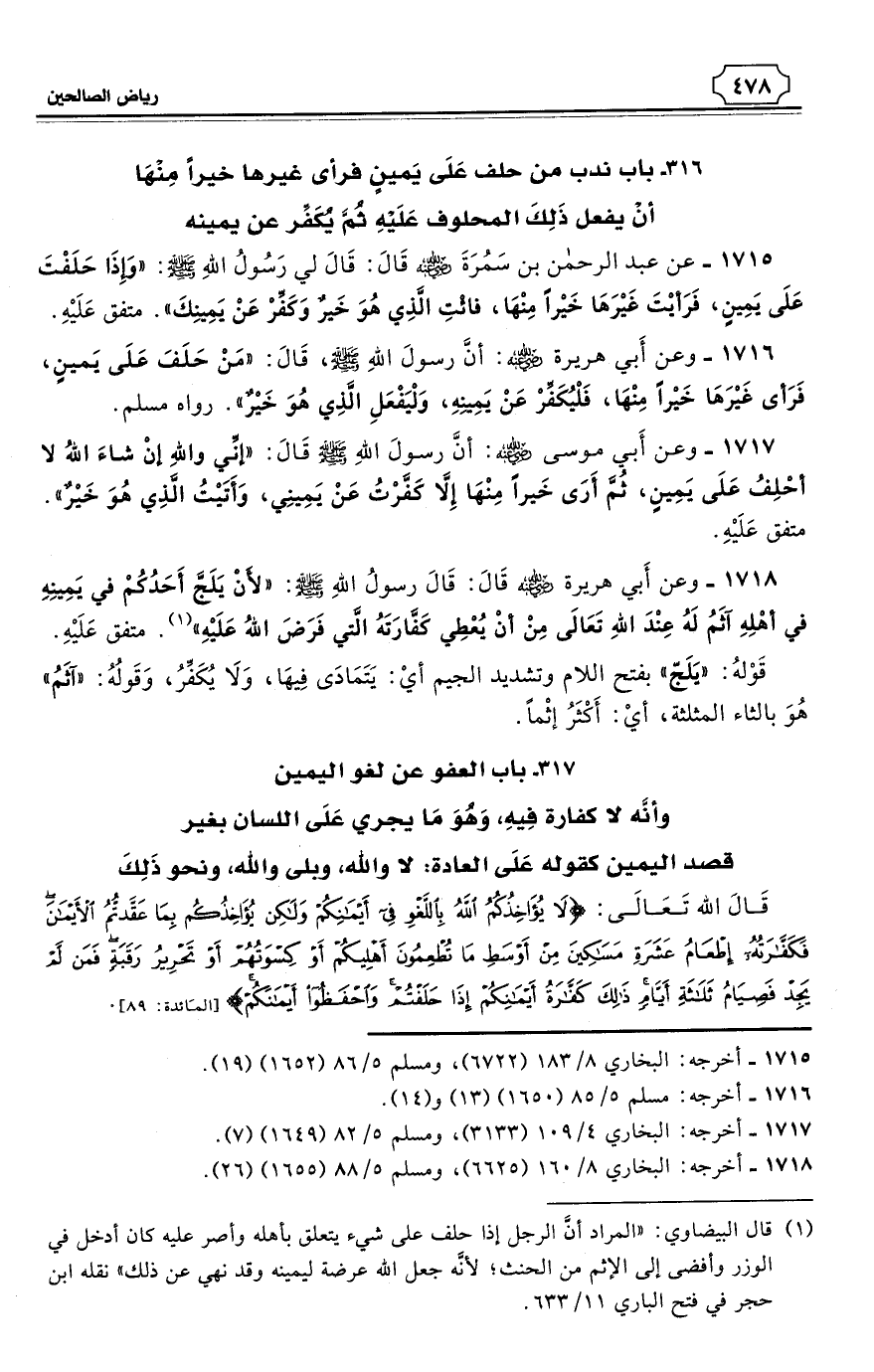 1715 - عن عبد الرحمان بن سَمُرَةَ - رضي الله عنه - قَالَ: قَالَ لي رَسُولُ اللهِ - صلى الله عليه وسلم: «وَإِذَا حَلَفْتَ عَلَى يَمِينٍ، فَرَأيْتَ غَيْرَهَا خَيْرًا مِنْهَا، فَأتِ الَّذِي هُوَ خَيرٌ وَكَفِّرْ عَنْ يَمِينِكَ». متفق عَلَيْهِ. (¬1)