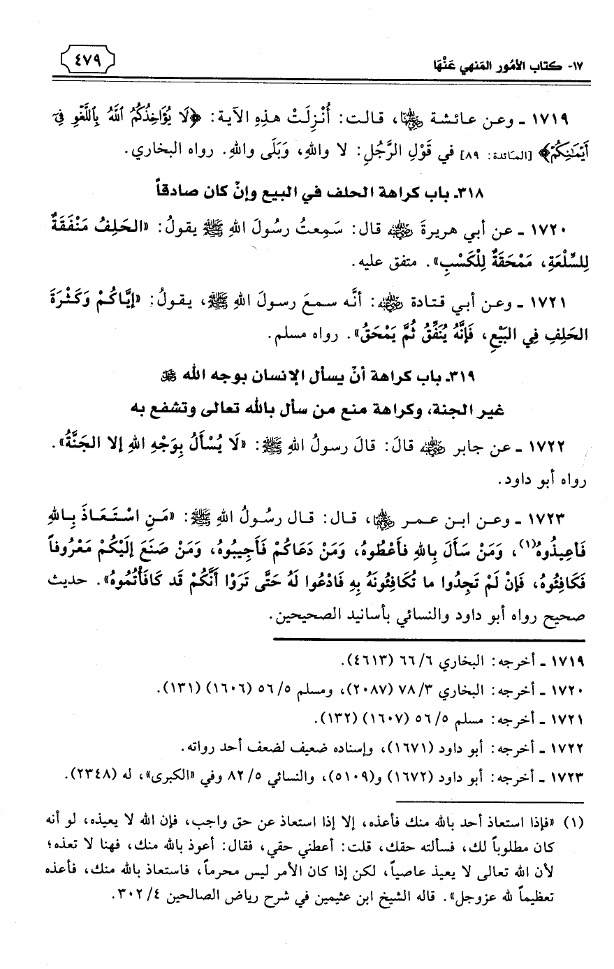 1722 - عن جابر - رضي الله عنه - قالَ: قالَ رسولُ اللهِ - صلى الله عليه وسلم: «لاَ يُسْأَلُ بِوَجْهِ اللهِ إلاَّ الجَنَّةُ». رواه أبو داود. (¬1)