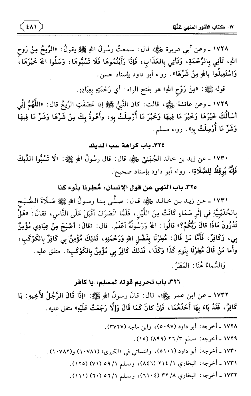 1731 - عن زيد بن خالد - رضي الله عنه - قال: صلَّى بنا رسولُ اللهِ - صلى الله عليه وسلم - صَلاَةَ الصُّبْحِ بِالحُدَيْبِيَّةِ في إِثْرِ سَمَاءٍ كَانَتْ مِنَ اللَّيْلِ، فَلَمَّا انْصَرَفَ أَقْبَلَ عَلَى النَّاسِ، فقالَ: «هَلْ تَدْرُونَ مَاذَا قالَ رَبُّكُمْ؟» قالُوا: اللهُ وَرَسُولُهُ أعْلَمُ. قال: «قالَ: أصْبَحَ مِنْ عِبَادِي مُؤْمِنٌ بِي، وَكَافِرٌ، فَأَمَّا مَنْ قَالَ: مُطِرْنَا بِفَضْلِ اللهِ وَرَحْمَتِهِ، فَذلِكَ مُؤْمِنٌ بِي كَافِرٌ بِالكَوْكَبِ، وأَما مَنْ قَالَ مُطِرْنَا بِنَوءِ كَذَا وَكَذَا، فَذلكَ كَافِرٌ بِي مُؤْمِنٌ بِالكَوْكَبِ». متفق عليه. (¬1)