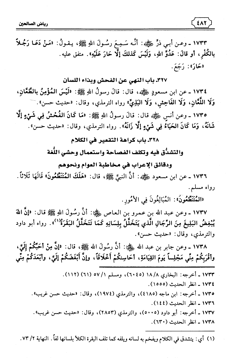 328 - باب كراهة التقعير في الكلام والتشدُّق فيه وتكلف الفصاحة واستعمال وحشي اللُّغة