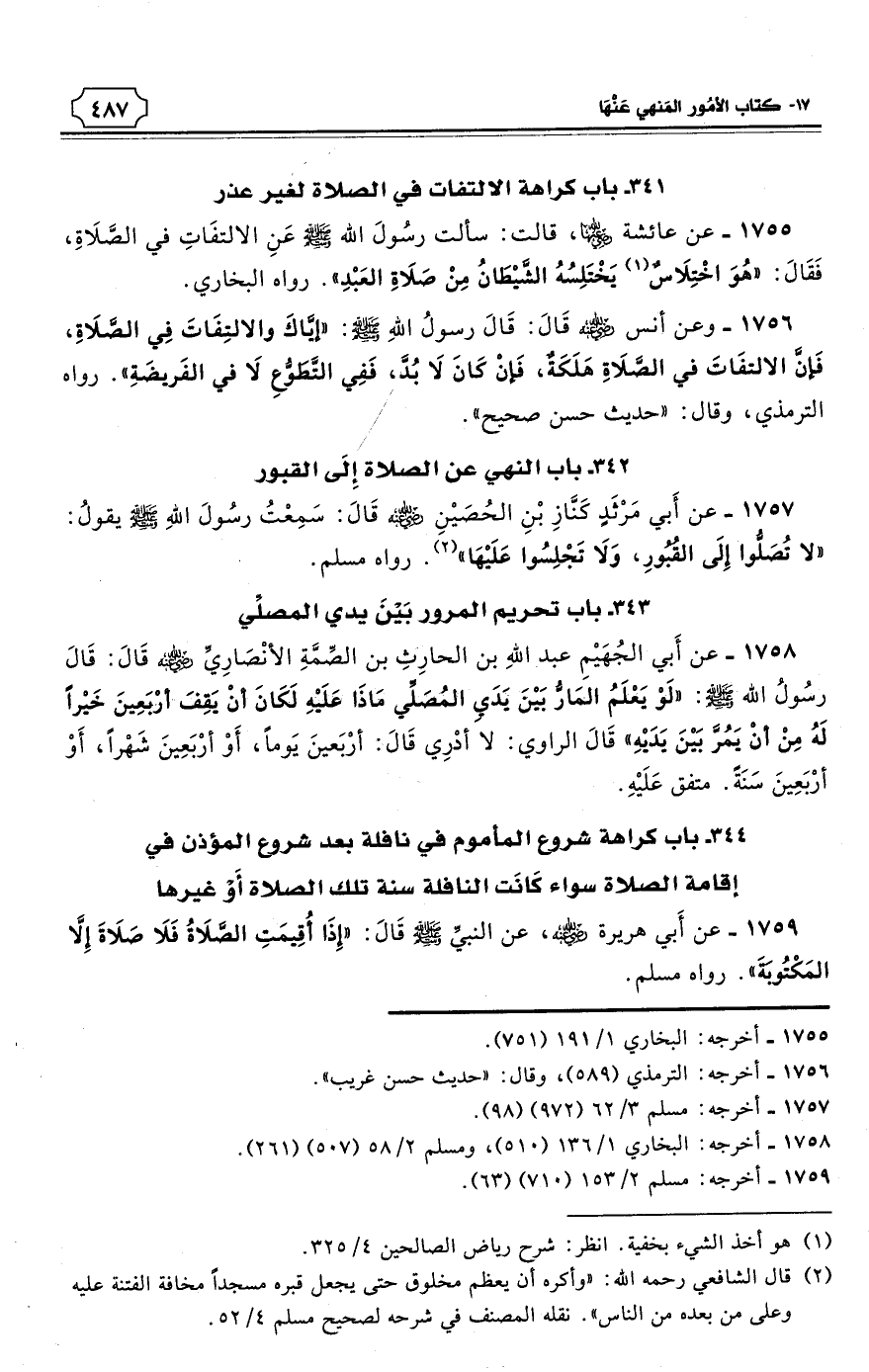 1758 - عن أَبي الجُهَيْمِ عبد اللهِ بن الحارِثِ بن الصِّمَّةِ الأنْصَارِيِّ - رضي الله عنه - قَالَ: قَالَ رسُولُ الله - صلى الله عليه وسلم: «لَوْ يَعْلَمُ المَارُّ بَيْنَ يَدَيِ المُصَلِّي مَاذَا عَلَيْهِ لَكَانَ أَنْ يَقِفَ أرْبَعِينَ خَيْرًا لَهُ مِنْ أَنْ يَمُرَّ بَيْنَ يَدَيْهِ».