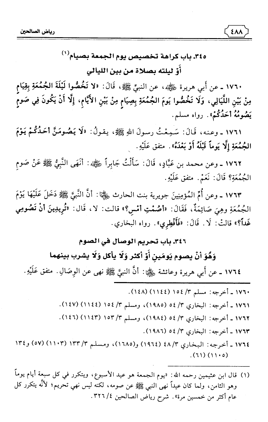 1760 - عن أَبي هريرة - رضي الله عنه - عن النبيِّ - صلى الله عليه وسلم - قَالَ: «لا تَخُصُّوا لَيْلَةَ الجُمُعَةِ بِقِيَامٍ مِنْ بَيْنِ اللَّيَالِي، وَلاَ تَخُصُّوا يَومَ الجُمُعَةِ بِصِيَامٍ مِنْ بَيْنِ الأَيَّامِ، إِلاَّ أَنْ يَكُونَ فِي صَومٍ يَصُومُهُ أحَدُكُمْ». رواه مسلم. (¬2)