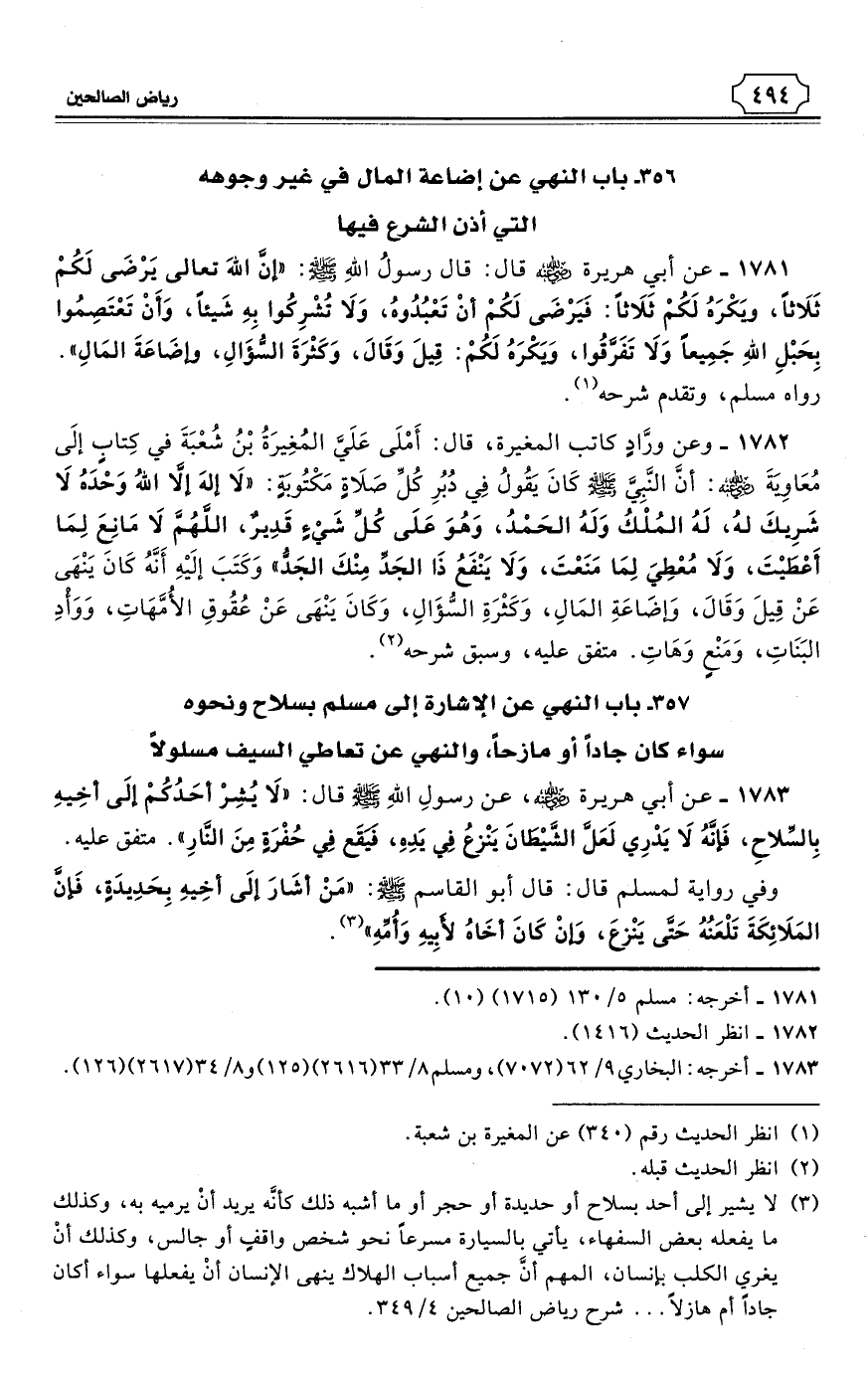 1781 - عن أبي هريرة - رضي الله عنه - قال: قال رسولُ اللهِ - صلى الله عليه وسلم: «إنَّ اللهَ تعالى يَرْضَى لَكُمْ ثَلاَثًا، ويَكْرَهُ لَكُمْ ثَلاَثًا: فَيَرْضَى لَكُمْ أَنْ تَعْبُدُوهُ، وَلاَ تُشْرِكُوا بِهِ شَيئًا، وَأَنْ تَعْتَصِمُوا بِحَبْلِ اللهِ جَمِيعًا وَلاَ تَفَرَّقُوا، وَيَكْرَهُ لَكُمْ: قِيلَ وَقَالَ، وَكَثْرَةَ السُّؤَالِ، وإضَاعَةَ المَالِ». رواه مسلم، (¬1) وتقدم شرحه (¬2).