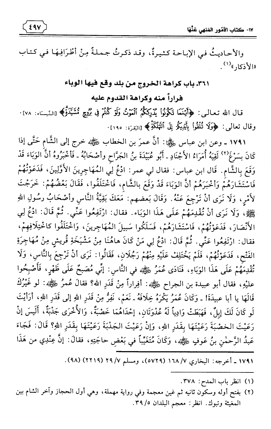 361 - باب كراهة الخروج من بلد وقع فيها الوباء فرارًا منه وكراهة القدوم عليه