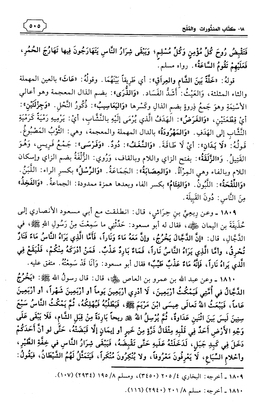1810 - وعن عبد الله بن عمرو بن العاص رضي الله عنهما، قال: قال رسولُ الله - صلى الله عليه وسلم: «يَخْرُجُ الدَّجَّالُ في أُمَّتِي فَيَمْكُثُ أرْبَعِينَ، لاَ أدْرِي أرْبَعِينَ يَومًا أو أرْبَعِينَ شَهْرًا، أو أرْبَعِينَ عَامًا، فَيَبْعَثُ اللهُ تَعالَى عِيسَى ابْنَ مَرْيَمَ - صلى الله عليه وسلم - فَيَطْلُبُهُ فَيُهْلِكُهُ، ثُمَّ يَمْكُثُ النَّاسُ سَبْعَ سِنِينَ لَيسَ بَينَ اثْنَينِ عَدَاوةٌ، ثُمَّ يُرْسِلُ اللهُ - عز وجل - ريحًا بَارِدَةً مِنْ قِبَلِ الشَّامِ، فَلاَ يَبْقَى عَلَى وَجْهِ الأَرْضِ أَحَدٌ فِي قَلْبِهِ مِثْقَالُ ذَرَّةٍ مِنْ خَيرٍ أو إيمَانٍ إلاَّ قَبَضَتْهُ، حَتَّى لو أنَّ أَحَدَكُمْ دَخَلَ فِي كَبِدِ جَبَلٍ، لَدَخَلَتْهُ عَلَيهِ حَتَّى تَقْبِضَهُ، فَيَبْقَى شِرَارُ النَّاسِ في خِفَّةِ الطَّيْرِ، وأحْلامِ السِّبَاعِ، لاَ يَعْرِفُونَ مَعْرُوفًا، ولا يُنْكِرُونَ مُنْكَرًا، فَيَتَمَثَّلُ لَهُمُ الشَّيْطَانُ، فيَقُولُ: -[506]- ألاَ تَسْتَجِيبُونَ؟ فَيَقُولُونَ: فَمَا تأمُرُنَا؟ فَيَأمُرُهُمْ بِعِبَادَةِ الأوْثَانِ، وَهُمْ في ذلِكَ دَارٌّ رِزْقُهُمْ، حَسَنٌ عَيشُهُمْ، ثُمَّ يُنْفَخُ في الصُّورِ، فَلاَ يَسْمَعُهُ أحَدٌ إلاَّ أصْغَى لِيتًا وَرَفَعَ لِيتًا، وَأوَّلُ مَنْ يَسْمَعُهُ رَجُلٌ يَلُوطُ (¬1) حَوْضَ إبِلِهِ فَيُصْعَقُ ويُصْعَقُ النَّاسُ حولهُ، ثُمَّ يُرْسِلُ اللهُ -أو قالَ: يُنْزِلُ اللهُ - مَطَرًا كَأَنَّهُ الطَّلُّ أو الظِّلُّ، فَتَنْبُتُ مِنهُ أجْسَادُ النَّاسِ، ثُمَّ يُنْفَخُ فِيهِ أُخْرَى فَإِذَا هُمْ قِيَامٌ يَنْظُرُونَ، ثُمَّ يُقالُ: يا أَيُّهَا النَّاسُ هَلُمَّ إلَى رَبِّكُمْ، وَقِفُوهُمْ إنَّهُمْ مَسْئُولُونَ، ثُمَّ يُقَالُ: أخْرِجُوا بَعْثَ النَّارِ فَيُقَالُ: مِنْ كَمْ؟ فَيُقَالُ: مِنْ كُلِّ ألْفٍ تِسْعَمِئَةٍ وَتِسْعَةً وتِسْعِينَ؛ فَذَلِكَ يَومٌ يَجْعَلُ الوِلْدَانَ شِيبًا، وَذَلِكَ يَومَ يُكْشَفُ عَنْ سَاقٍ». رواه مسلم. (¬2)