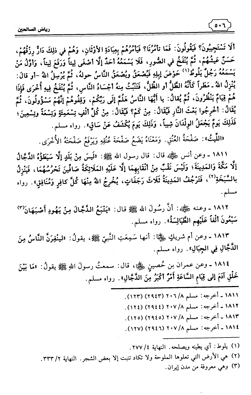 1811 - وعن أنس - رضي الله عنه - قال: قال رسول الله - صلى الله عليه وسلم: «لَيسَ مِنْ بَلَدٍ إلاَّ سَيَطَؤُهُ الدَّجَّالُ إلاَّ مَكَّةَ وَالمَدِينَةَ؛ وَلَيْسَ نَقْبٌ مِنْ أنْقَابِهِمَا إلاَّ عَلَيْهِ المَلاَئِكَةُ صَافِّينَ تَحْرُسُهُمَا، فَيَنْزِلُ بالسَّبَخَةِ (¬1)، فَتَرْجُفُ المَدِينَةُ ثَلاَثَ رَجَفَاتٍ، يُخْرِجُ اللهُ مِنْهَا كُلَّ كافِرٍ وَمُنَافِقٍ». رواه مسلم. (¬2)