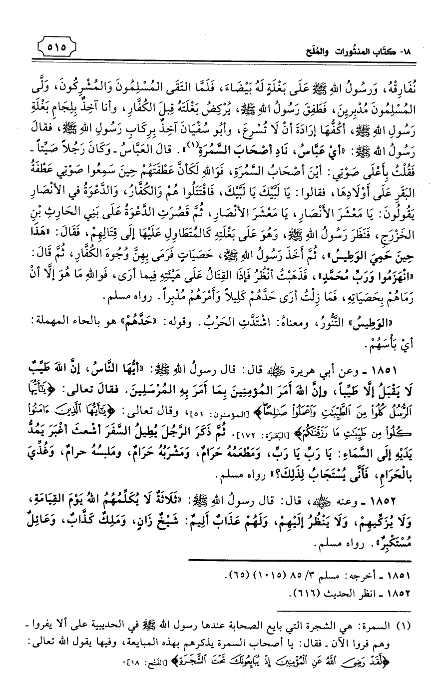 1851 - وعن أبي هريرة - رضي الله عنه - قال: قال رسولُ اللهِ - صلى الله عليه وسلم: «أيُّهَا النَّاسُ، إنَّ اللهَ طَيِّبٌ لاَ يَقْبَلُ إلاَّ طَيِّبًا، وإنَّ اللهَ أَمَرَ المُؤمِنِينَ بِمَا أَمَرَ بِهِ المُرْسَلِينَ. فقالَ تعالى: