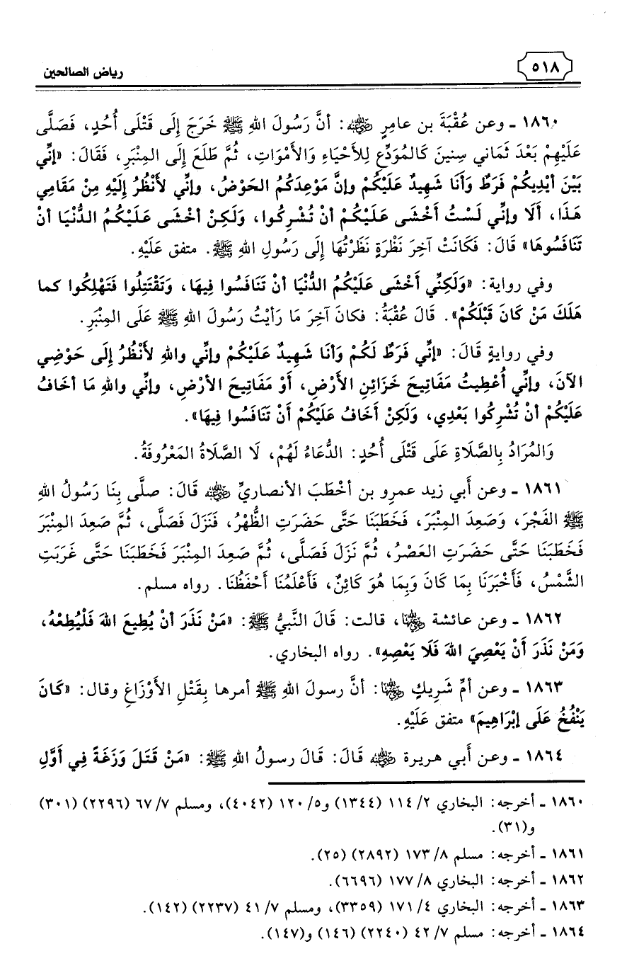 1860 - وعن عُقْبَةَ بن عامِرٍ - رضي الله عنه: أنَّ رَسُولَ اللهِ - صلى الله عليه وسلم - خَرَجَ إِلَى قَتْلَى أُحُدٍ، فَصَلَّى عَلَيْهِمْ بَعْدَ ثَمَانِ سِنينَ كَالمُوَدِّعِ لِلأَحْيَاءِ وَالأَمْوَاتِ، ثُمَّ طَلَعَ إِلَى المِنْبَرِ، فَقَالَ: «إنِّي بَيْنَ أيْدِيكُمْ فَرَطٌ وَأَنَا شَهِيدٌ عَلَيْكُمْ وإنَّ مَوْعِدَكُمُ الحَوْضُ، وإنِّي لأَنْظُرُ إِلَيْهِ مِنْ مَقَامِي هَذَا، أَلاَ وإنِّي لَسْتُ أَخْشَى عَلَيْكُمْ أَنْ تُشْرِكُوا، وَلَكِنْ أخْشَى عَلَيْكُمُ الدُّنْيَا أَنْ تَنَافَسُوهَا» قَالَ: فَكَانَتْ آخِرَ نَظْرَةٍ نَظَرْتُهَا إِلَى رَسُولِ اللهِ - صلى الله عليه وسلم. متفق عَلَيْهِ. (¬1)