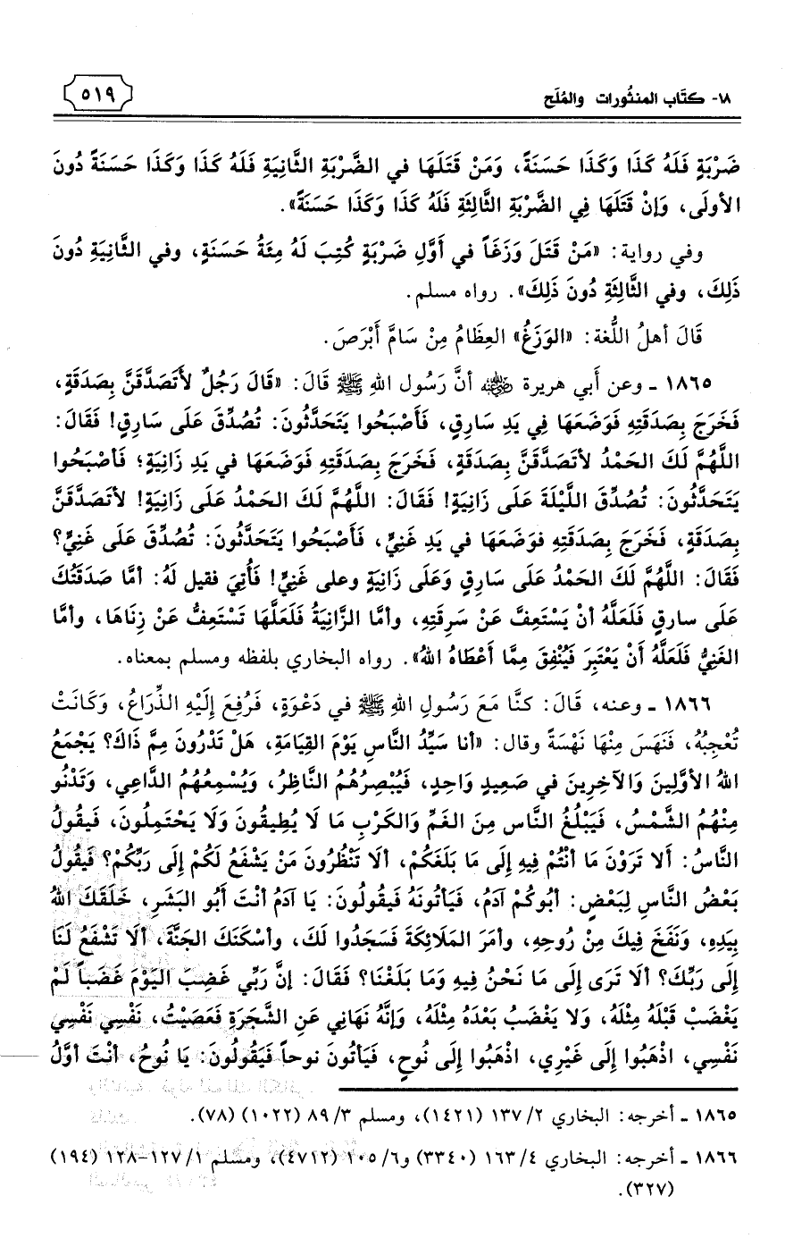 1866 - وعنه، قَالَ: كنَّا مَعَ رَسُولِ اللهِ - صلى الله عليه وسلم - في دَعْوَةٍ، فَرُفِعَ إِلَيْهِ الذِّرَاعُ، وَكَانَتْ تُعْجِبُهُ، فَنَهَسَ مِنْهَا نَهْسَةً وقال: «أَنَا سَيِّدُ النَّاسِ يَوْمَ القِيَامَةِ، هَلْ تَدْرُونَ مِمَّ ذَاكَ؟ يَجْمَعُ اللهُ الأوَّلِينَ وَالآخِرِينَ في صَعِيدٍ وَاحِدٍ، فَيُبْصِرُهُمُ النَّاظِرُ، وَيُسْمِعُهُمُ الدَّاعِي، وَتَدْنُو مِنْهُمُ الشَّمْسُ، فَيَبْلُغُ النَّاسُ مِنَ الغَمِّ وَالكَرْبِ مَا لاَ يُطِيقُونَ وَلاَ يَحْتَمِلُونَ، فَيقُولُ النَّاسُ: أَلاَّ تَرَوْنَ مَا أَنْتُمْ فِيهِ إِلَى مَا بَلَغَكُمْ، أَلاَ تَنْظُرُونَ مَنْ يَشْفَعُ لَكُمْ إِلَى رَبِّكُمْ؟ فَيقُولُ بَعْضُ النَّاسِ لِبَعْضٍ: أبُوكُمْ آدَمُ، فَيَأتُونَهُ فَيقُولُونَ: يَا آدَمُ أَنْتَ أَبُو البَشَرِ، خَلَقَكَ اللهُ بِيَدِهِ، وَنَفَخَ فِيكَ مِنْ رُوحِهِ، وأمَرَ المَلاَئِكَةَ فَسَجَدُوا لَكَ، وأَسْكَنَكَ الجَنَّةَ، ألاَ تَشْفَعُ لَنَا إِلَى رَبِّكَ؟ ألاَ تَرَى إِلَى مَا نَحْنُ فِيهِ وَمَا بَلَغْنَا؟ فَقَالَ: إنَّ رَبِّي غَضِبَ اليَوْمَ غَضَبًا لَمْ يَغْضَبْ قَبْلَهُ مِثْلَهُ، وَلا يَغْضَبُ بَعْدَهُ مِثْلَهُ، وَإنَّهُ نَهَانِي عَنِ الشَّجَرَةِ فَعَصَيْتُ، نَفْسِي نَفْسِي نَفْسِي، اذْهَبُوا إِلَى غَيْرِي، اذْهَبُوا إِلَى نُوحٍ، فَيَأتُونَ نوحًا فَيَقُولُونَ: يَا نُوحُ، أَنْتَ أوَّلُ