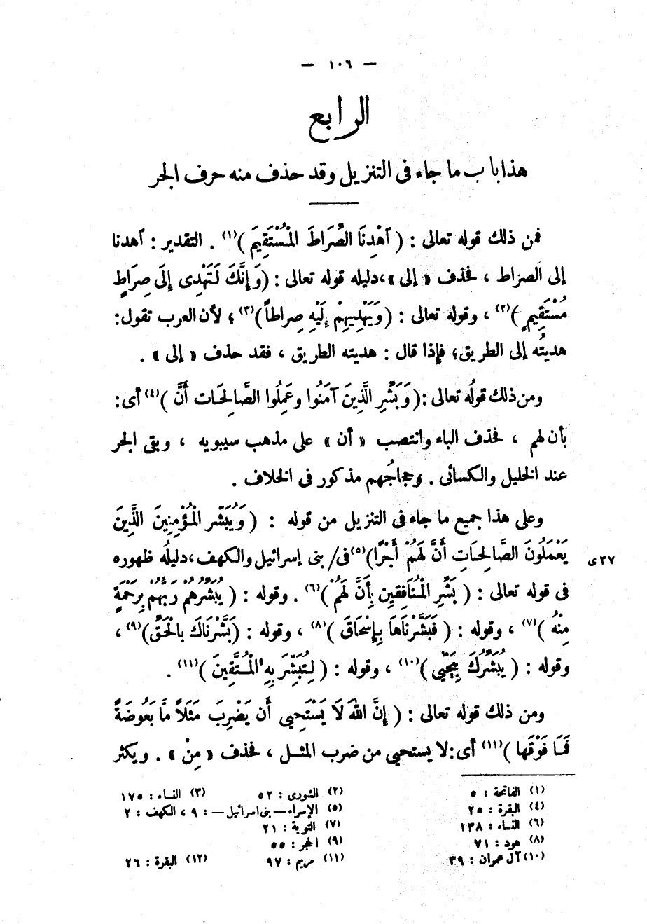 هذا باب ما جاء في التنزيل وقد حذف منه حرف الجر فمن ذلك قوله تعالى: (اهْدِنَا الصِّراطَ الْمُسْتَقِيمَ) «1» . التقدير: اهدنا إلى الصراط، فحذف «إلى» ، دليله قوله تعالى: (وَإِنَّكَ لَتَهْدِي إِلى صِراطٍ مُسْتَقِيمٍ) «2» ، وقوله تعالى: (وَيَهْدِيهِمْ إِلَيْهِ صِراطاً) «3» لأن العرب تقول: