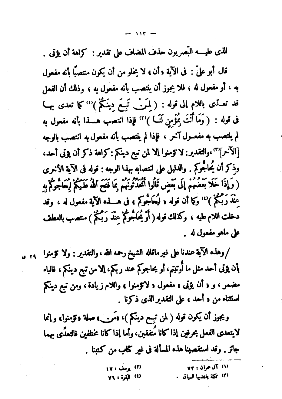/ وهذه الآية عندنا على غير ما قاله الشيخ رحمه الله، والتقدير: ولا تؤمنوا بأن يؤتي أحد مثل ما أوتيتم، أو يحاجوكم عند ربكم، إلا من تبع دينكم، فالباء مضمر، و «أن يؤتي» مفعول «لا تؤمنوا» واللام زيادة، ومن تبع دينكم استثناء من «أحد» على التقدير الذي ذكرنا.