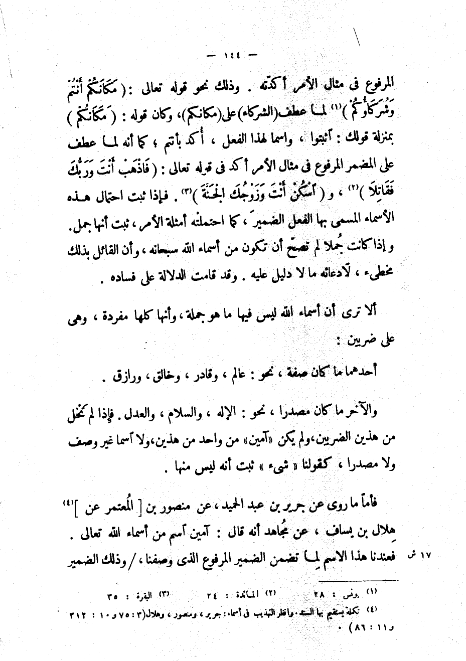 والآخر ما كان مصدراً، نحو: الإله، والسلام، والعدل. فإذا لم تخل من هذين الضربين، ولم يكن «آمين» من واحد من هذين، ولا اسما غير وصف ولا مصدرا، كقولنا «شىء» ثبت أنه ليس منها.