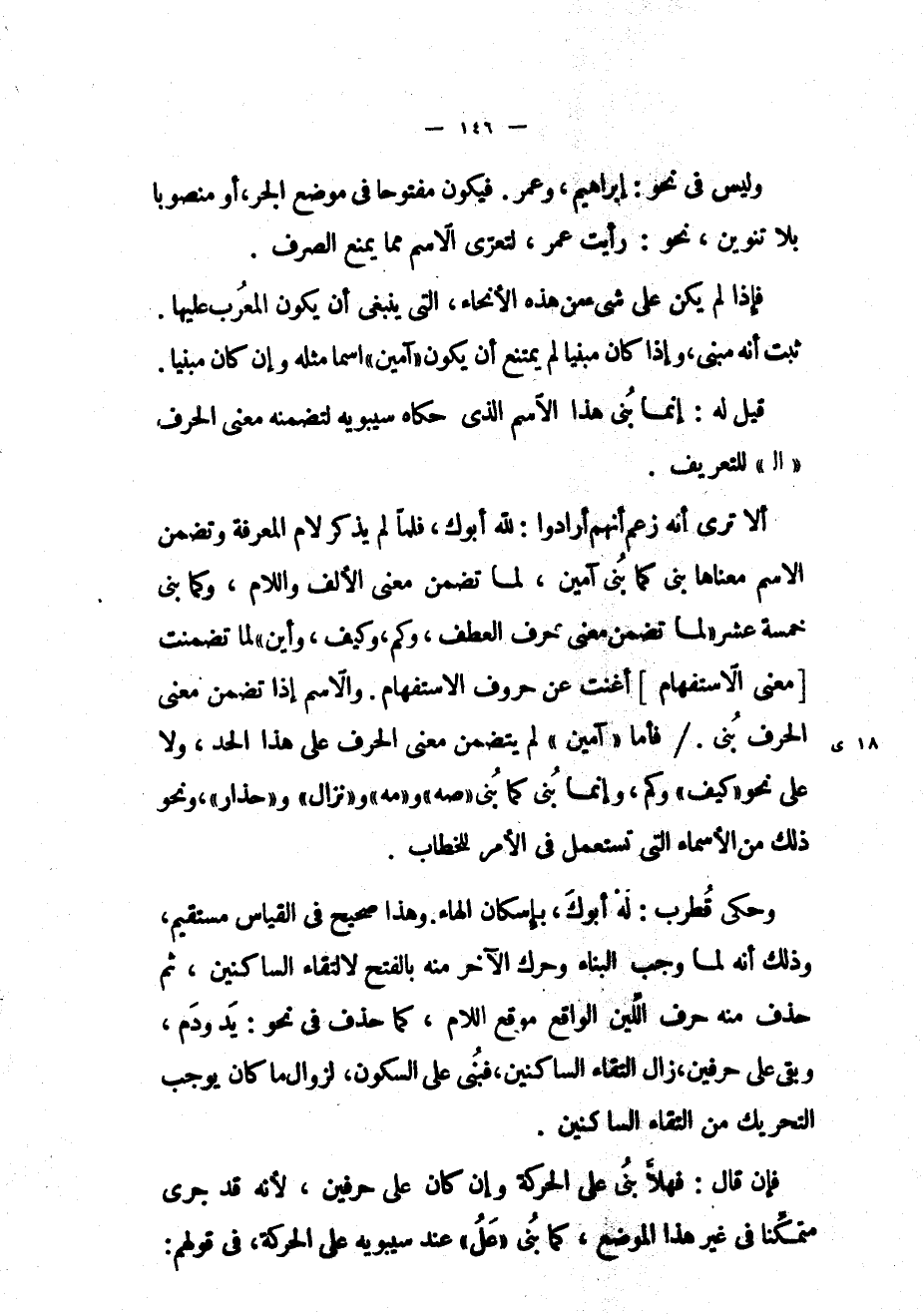 فإن قال: فهلا بني على الحركة وإن كان على حرفين، لأنه قد جرى متمكناً في غير هذا الموضع، كما بني «عل» عند سيبويه على الحركة، في قولهم: