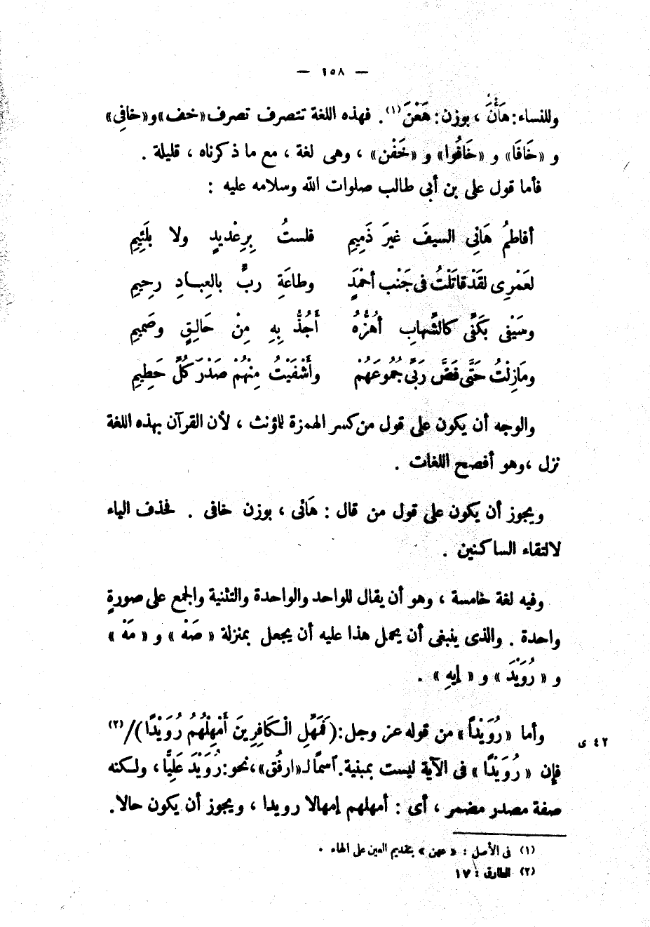 وللنساء: هأن، بوزن: هعن «1» . فهذه اللغة تتصرف تصرف «خف» و «خافى» و «خافا» و «خافوا» و «خفن» ، وهي لغة، مع ما ذكرناه، قليلة.
