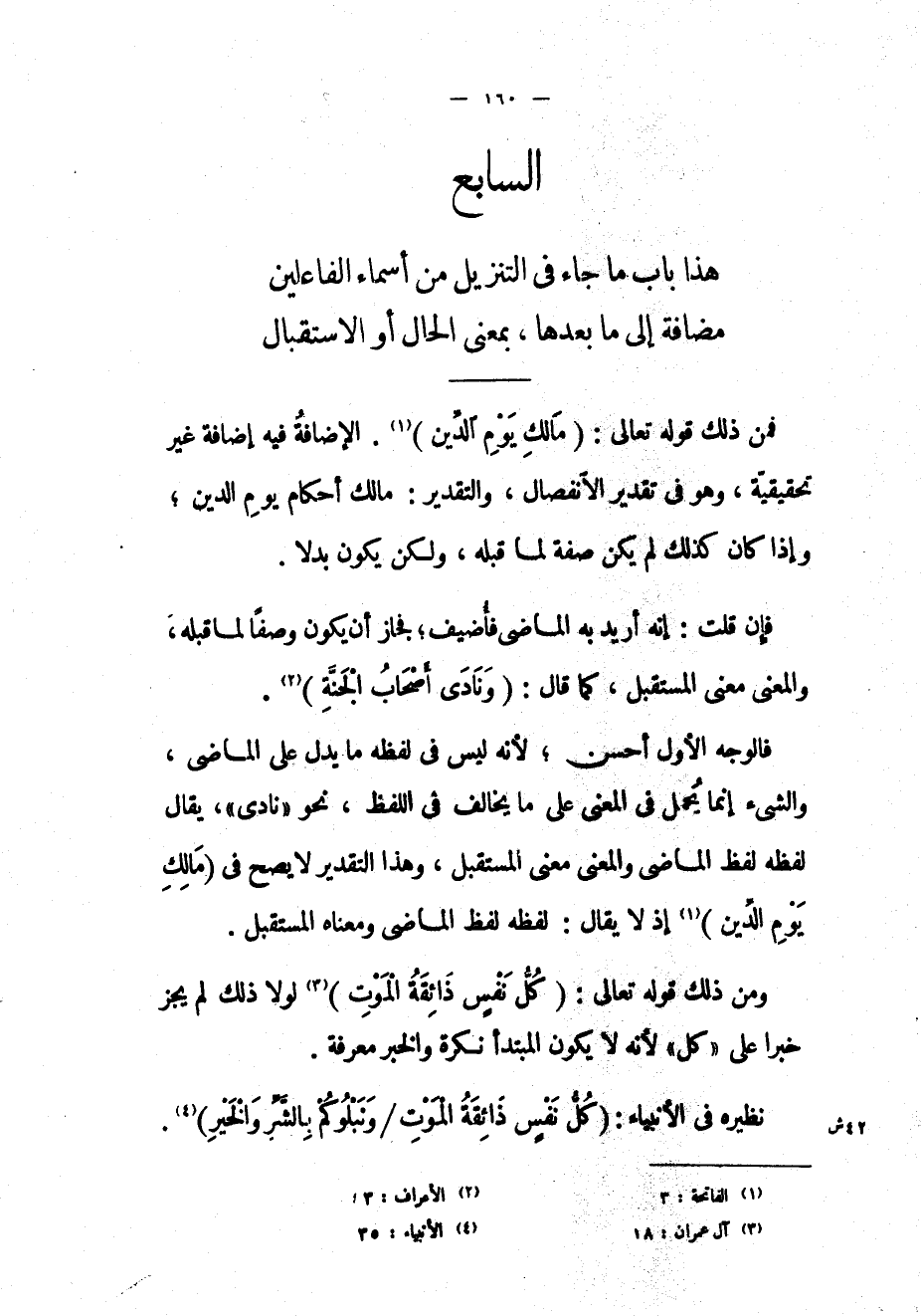 هذا باب ما جاء في التنزيل من أسماء الفاعلين مضافة إلى ما بعدها، بمعنى الحال أو الاستقبال فمن ذلك قوله تعالى: (مالِكِ يَوْمِ الدِّينِ) «1» . الإضافة فيه إضافة غير تحقيقيه، وهو في تقدير الانفصال، والتقدير: مالك أحكام يوم الدين وإذا كان كذلك لم يكن صفة لما قبله، ولكن يكون بدلا.