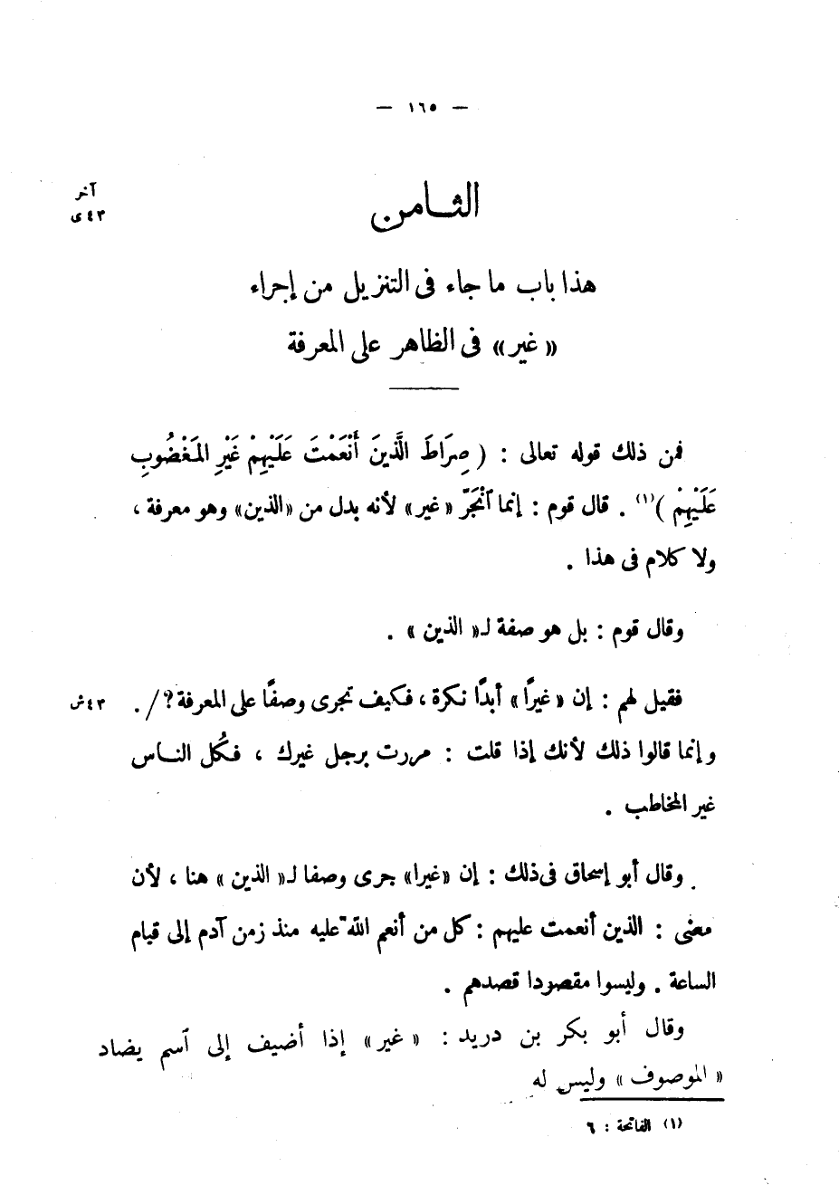 هذا باب ما جاء في التنزيل من إجراء «غير» في الظاهر على المعرفة فمن ذلك قوله تعالى: (صِراطَ الَّذِينَ أَنْعَمْتَ عَلَيْهِمْ غَيْرِ الْمَغْضُوبِ عَلَيْهِمْ) «1» . قال قوم: إنما انجر «غير» لأنه بدل من «الذين» وهو معرفة، ولا كلام في هذا.