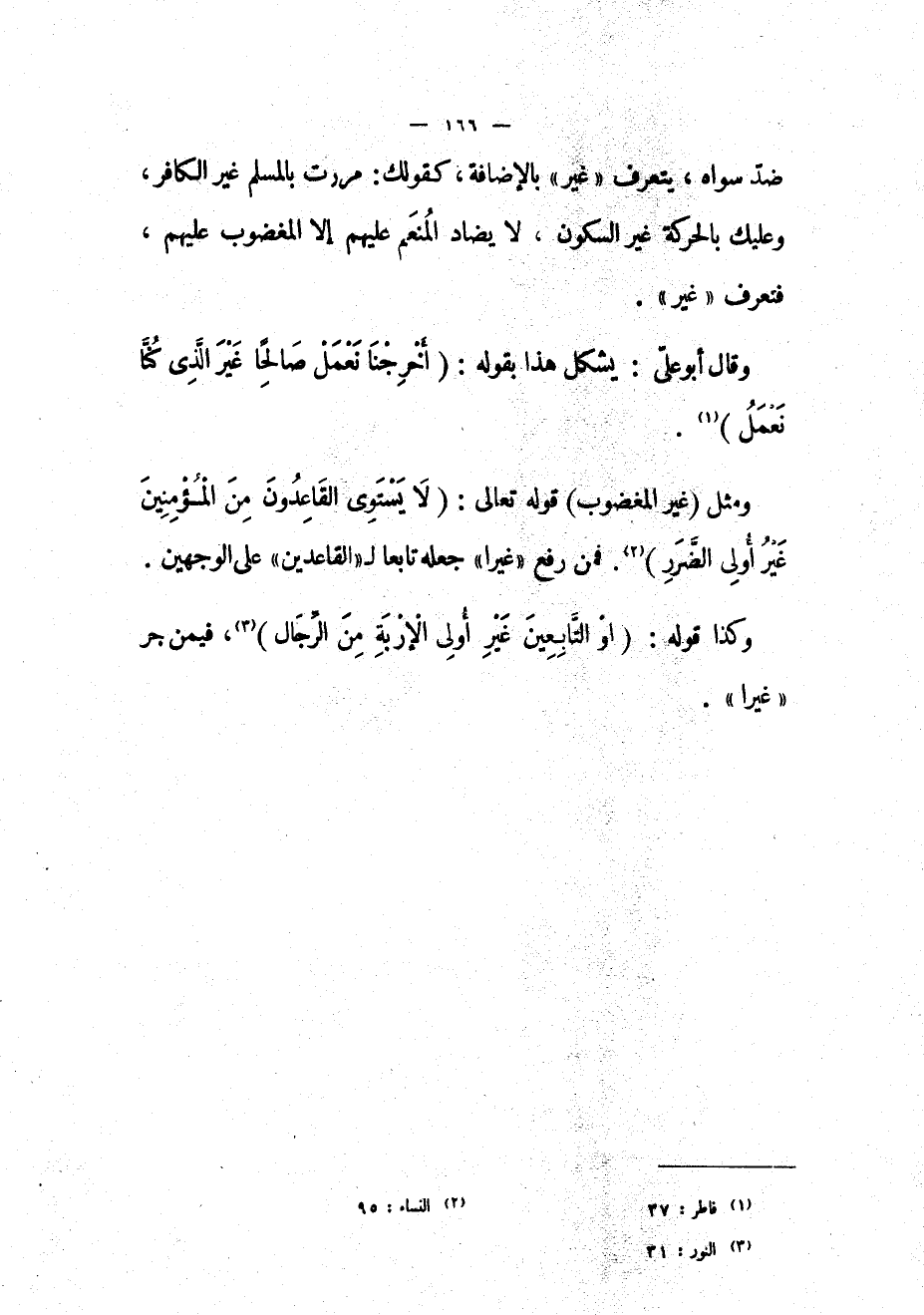 ومثل (غَيْرِ الْمَغْضُوبِ) قوله تعالى: (لا يَسْتَوِي الْقاعِدُونَ مِنَ الْمُؤْمِنِينَ غَيْرُ أُولِي الضَّرَرِ) «2» . فمن رفع «غيرا» جعله تابعاً ل «القاعدين» على الوجهين.