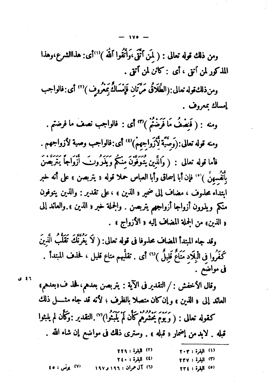 فأما قوله تعالى: (وَالَّذِينَ يُتَوَفَّوْنَ مِنْكُمْ وَيَذَرُونَ أَزْواجاً يَتَرَبَّصْنَ بِأَنْفُسِهِنَّ) «5» فإن أبا إسحاق وأبا العباس حملا قوله «يتربصن» على أنه خبر ابتداء محذوف، مضاف إلى ضمير «الذين» ، على تقدير: والذين يتوفون منكم ويذرون أزواجاً أزواجهم يتربصن. والجملة خبر «الذين» . والعائد إلى «الذين» من الجملة المضاف إليه «الأزواج» .