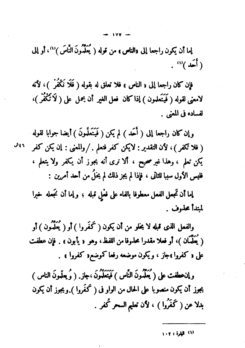 وإن كان راجعاً إلى (أَحَدٍ) لم يكن (فَيَتَعَلَّمُونَ) أيضاً جواباً لقوله (فَلا تَكْفُرْ) ، لأن التقدير: لا يكن كفر فتعلم. / والمعنى: إن يكن كفر يكن تعلم، وهذا غير صحيح، ألا ترى أنه يجوز أن يكفر ولا يتعلم، فليس الأول سبباً للثاني، فإذا لم يجز ذلك لم يخل من أحد أمرين: