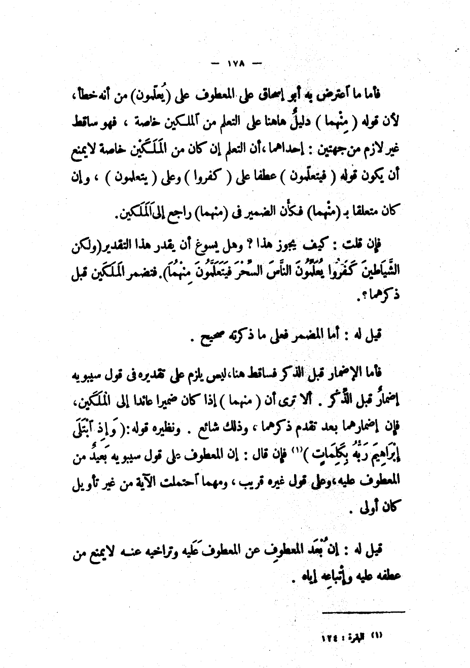 فأما ما اعترض به أبو إسحاق على المعطوف على (يُعَلِّمُونَ) من أنه خطأ، لأن قوله (مِنْهُما) دليل هاهنا على التعلم من الملكين خاصة، فهو ساقط غير لازم من جهتين: إحداهما، أن التعلم إن كان من الملكين خاصة لا يمنع أن يكون قوله (فَيَتَعَلَّمُونَ) عطفاً على (كَفَرُوا) وعلى (يَتَعَلَّمُونَ) ، وإن كان متعلقاً ب (مِنْهُما) فكأن الضمير في (مِنْهُما) راجع إلى الملكين.