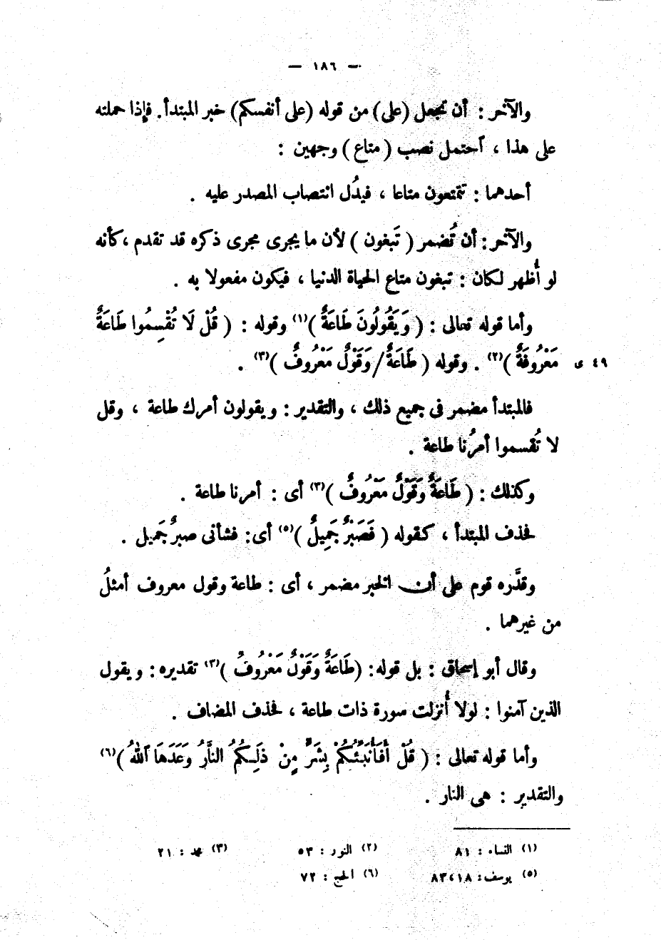 وأما قوله تعالى: (وَيَقُولُونَ طاعَةٌ) «1» وقوله: (قُلْ لا تُقْسِمُوا طاعَةٌ مَعْرُوفَةٌ)