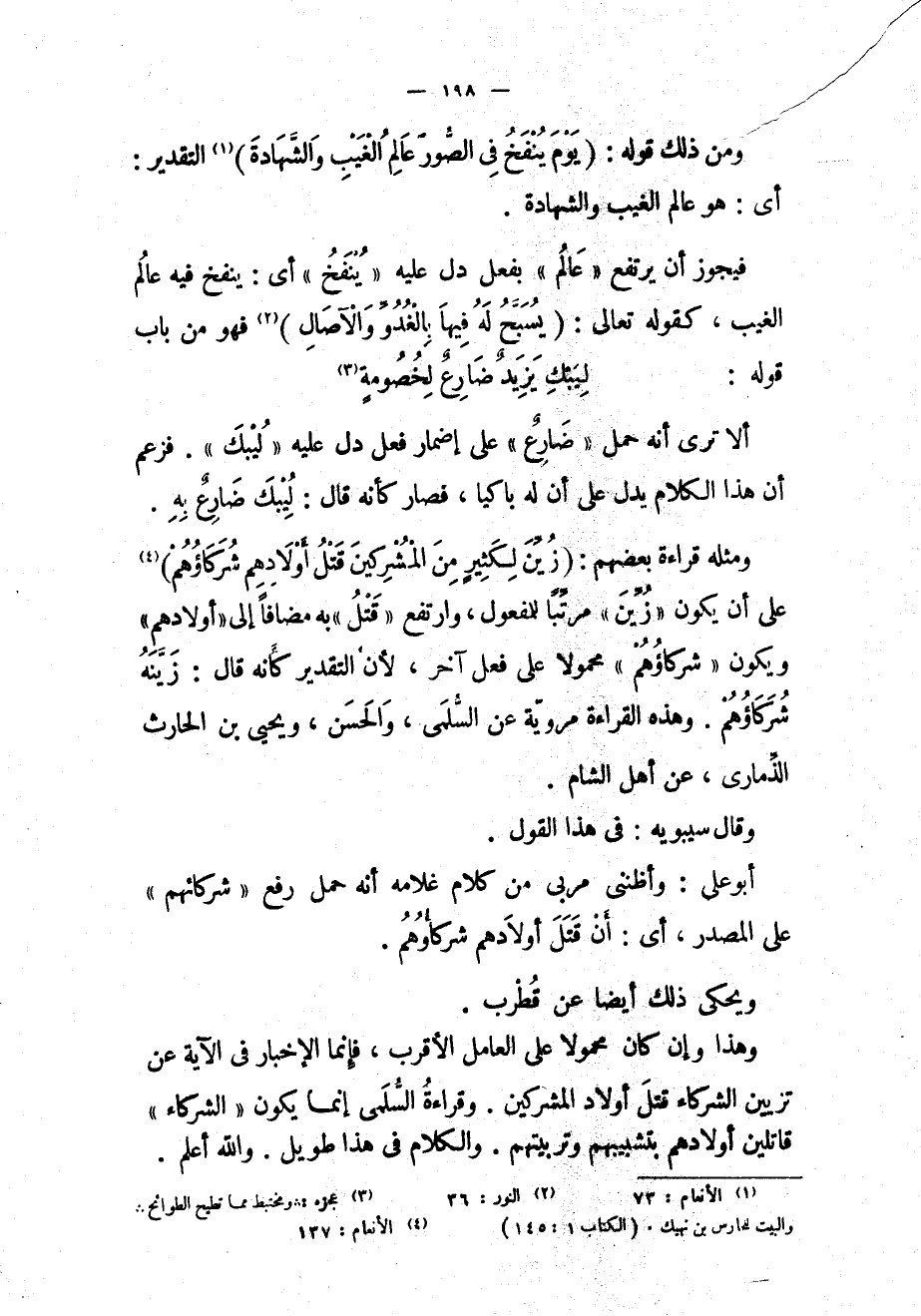 وهذا وإن كان محمولا على العامل الأقرب، فإنما الإخبار في الآية عن تزيين الشركاء قتل أولاد المشركين. وقراءة السلمى إنما يكون «الشركاء» قاتلين أولادهم بتشبيبهم وتربيتهم. والكلام في هذا طويل. والله أعلم.