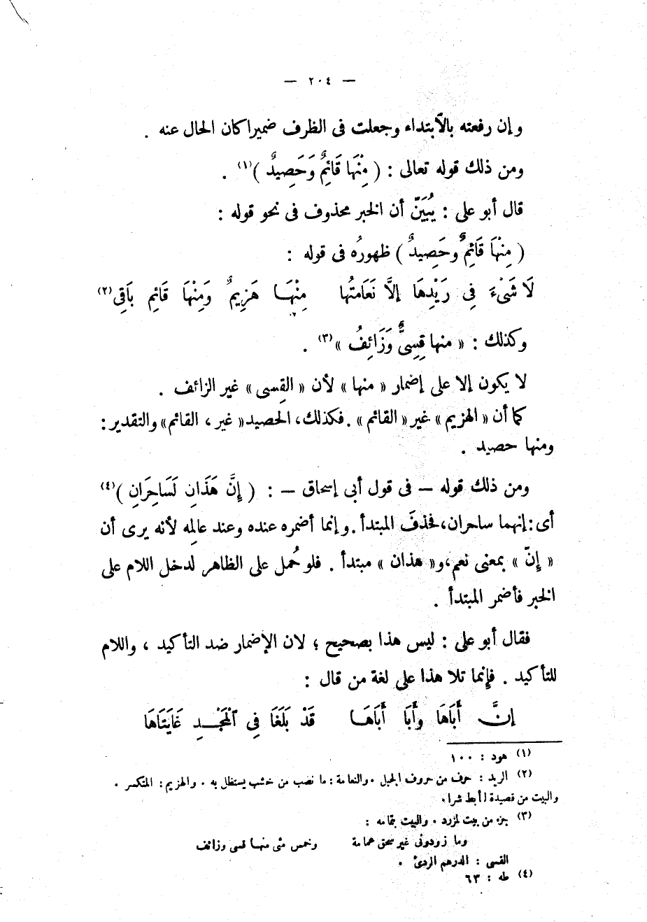 ومن ذلك قوله- في قول أبي إسحاق-: (إِنْ هذانِ لَساحِرانِ) «4» أي: إنهما ساحران، فحذف المبتدأ. وإنما أضمره عنده وعند عالمه لأنه يرى أن «إنّ» بمعنى نعم، و «هذان» مبتدأ. فلو حمل على الظاهر لدخل اللام على الخبر فأضمر المبتدأ.