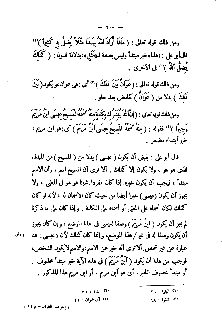 قال أبو على: بنبغي أن يكون (عِيسَى) بدلاً من (الْمَسِيحُ) من المبدل الذي هو هو، ولا يكون إلا كذلك. ألا ترى أن المسيح اسم، وأن الاسم مبتدأ، فيجب أن يكون خبره. إذا كان مفرداً. شيئاً هو هو في المعنى، ولا يجوز أن يكون (عِيسَى) خبراً أيضاً من حيث كان الاسمان له، لأنه لو كان كذلك لكان أسماه على المعنى أو أسماه على الكلمة. وإذا كان على ما ذكرنا لم يجز أن يكون (ابْنُ مَرْيَمَ) وصفاً لعيسى في هذا الموضع، وإن كان يجوز أن يكون وصفاً له في غير/ هذا الموضع، وإنما كان كذلك لأن «عيسى» هنا عبارة عن غير شخص. ألا ترى أنه خبر عن الاسم، والاسم لا يكون الشخص، فوجب من هذا أن يكون (ابْنُ مَرْيَمَ) في هذه الآية خبر مبتدأ محذوف.