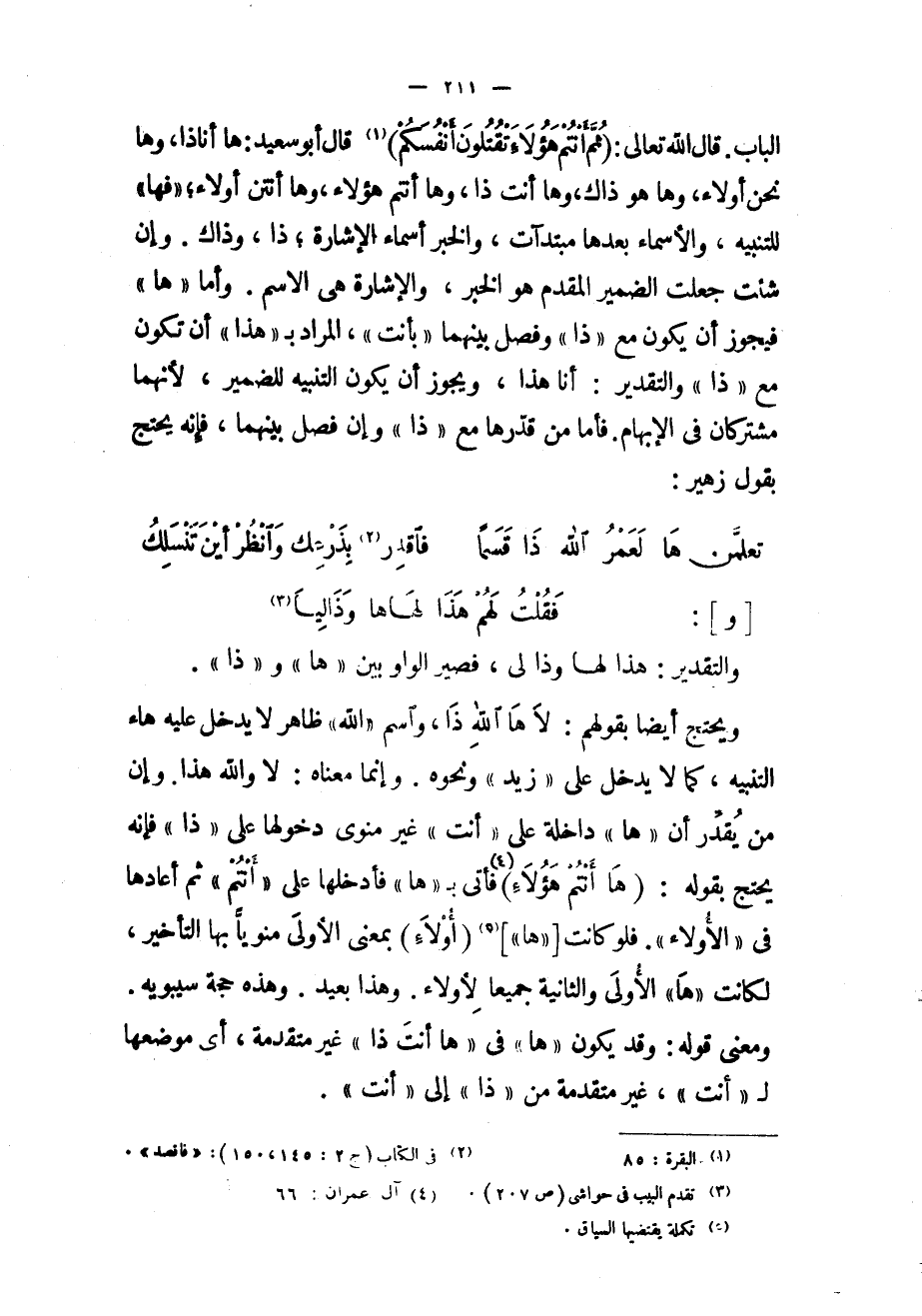 ويحتج أيضاً بقولهم: لا ها الله ذا، واسم «الله» ظاهر لا يدخل عليه هاء التنبيه، كما لا يدخل على «زيد» ونحوه. وإنما معناه: لا والله هذا. وإن من يقدر أن «ها» داخلة على «أنت» غير منوى دخولها على «ذا» فإنه يحتج بقوله: (ها أَنْتُمْ هؤُلاءِ) «4» فأتى ب «ها» فأدخلها على «أنتم» ثم أعادها في «الأولاء» . فلو كانت [ «ها» ] «5» (أولاء) بمعنى الاولى منوياً بها التأخير، لكانت «ها» الأولى والثانية جميعاً لأولاء. وهذا بعيد. وهذه حجة سيبويه.