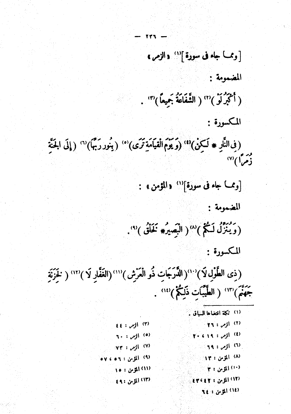 (ذِي الطَّوْلِ لا) «11» (الدَّرَجاتِ ذُو الْعَرْشِ) «12» (الْغَفَّارِ (42) لا) «13» (لِخَزَنَةِ جَهَنَّمَ) «14» (الطَّيِّباتِ ذلِكُمُ) «15» .